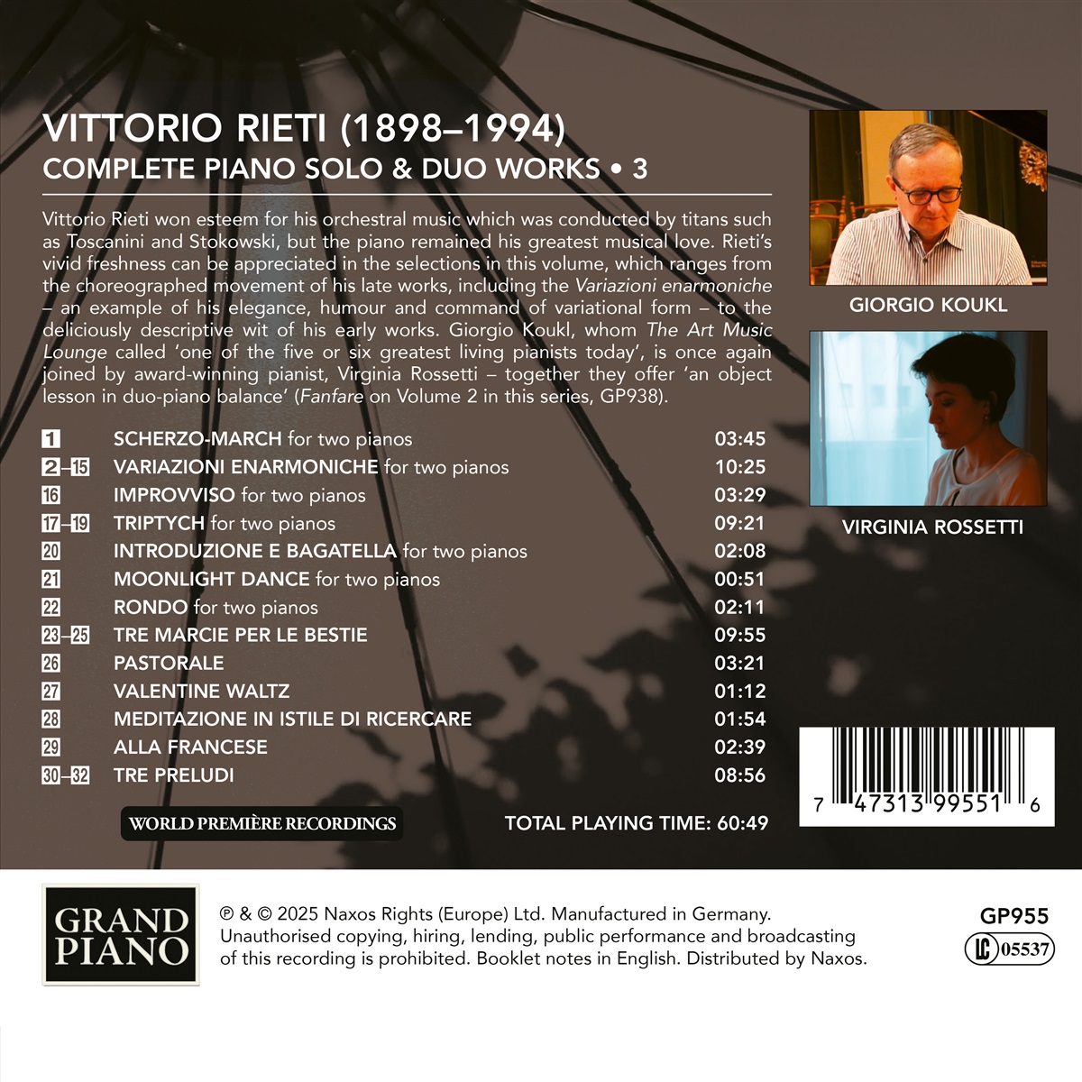 Vittorio Rieti erlangte Anerkennung für seine Orchestermusik, die von Dirigenten-Legenden wie Toscanini und Stokowski dirigiert wurde, aber das Klavier blieb seine größte musikalische Liebe. Rietis lebendige Frische kommt in den ausgewählten Stücken dieses Albums zum Ausdruck, die von den choreografierten Sätzen seiner Spätwerke, darunter die „Variazioni enarmoniche“ bis hin zu seinen frühen wunderbar geistreichen Werken reichen. Giorgio Koukl, den die Art Music Lounge einen der fünf oder sechs größten lebenden Pianisten unserer Zeit nennt, wird erneut von der preisgekrönten Pianistin Virginia Rossetti begleitet. Giorgio Koukl ist ein tschechischer Pianist, Cembalist und Komponist. Er studierte unter anderem bei Rudolf Firkušný, einem Freund und Fürsprecher des tschechischen Komponisten Bohuslav Martinů. Durch Firkušný kam er erstmals mit Martinůs Musik in Berührung und gilt heute als einer der weltweit führenden Interpreten von Martinůs Klaviermusik. Zudem hat Koukl das gesamte Soloklavierwerk von Paul Le Flem, Alexander Tcherepnin, Arthur Lourié, Vítězslava Kaprálová, Witold Lutosławski und in jüngerer Zeit von Alexandre Tansman und Tibor Harsányi aufgenommen. Virginia Rossetti erlangte einen Master of Performing Arts mit Auszeichnung an der Hochschule für Musik in Basel und ist Preisträgerin mehrerer nationaler und internationaler Klavierwettbewerbe, darunter der Premio Venezia und der Premio Marizza in Triest.