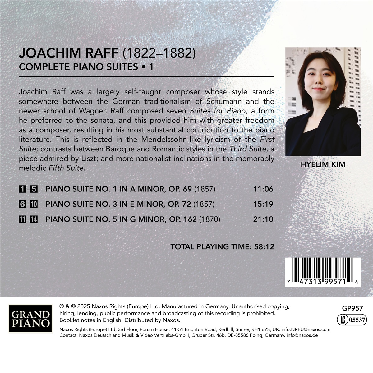 Joachim Raff war ein weitgehend autodidaktischer Komponist, dessen Stil zwischen dem deutschen Traditionalismus von Robert Schumann und der neueren Schule von Richard Wagner anzusiedeln ist. Raff komponierte sieben „Suiten für Klavier“, eine Form, die er der Sonate vorzog und die ihm als Komponist größere Freiheit bot, daher ist sein Beitrag zur Klavierliteratur hauptsächlich diesem Genre gewidmet. Dies spiegelt sich in der Mendelssohn-artigen Lyrik der „Ersten Suite“, den Kontrasten zwischen Barock und Romantik in der „Dritten Suite“, einem von Franz Liszt bewunderten Stück, und den eher nationalistischen Tendenzen in der einprägsam melodischen Fünften Suite wider. Hyelim Kim ist Preisträgerin bedeutender internationaler Klavierwettbewerbe, darunter die Clara Haskil (Vevey) und Arcangelo Speranza (Taranto) International Piano Competitions, der Hastings International Piano Concerto Competition, Les Étoiles du Piano (Roubaix) und der Annarosa Taddei International Competition (Rom). Ihr Orchesterdebüt gab sie im Alter von zehn Jahren mit der Filarmonica „Mihail Jora” Bacău und trat seitdem unter anderem mit dem Royal Philharmonic Orchestra, der Southbank Sinfonia, dem Zermatt Festival Orchestra, dem Orchestre de Picardie, dem Gürzenich Orchester Köln und dem Orchestre Philharmonique du Maroc auf. Kim trat in Korea und in ganz Europa an Veranstaltungsorten wie der Elbphilharmonie Hamburg, der Tonhalle Düsseldorf, der Kölner Philharmonie, dem Flagey Brüssel und dem TivoliVredenburg Utrecht auf. Sie hat einen Bachelor-Abschluss der Robert-Schumann-Hochschule Düsseldorf und einen Master-Abschluss der Hochschule für Musik und Tanz Köln. Diese Veröffentlichung ist die erste moderne Aufnahme von Raffs Klaviersuiten. Sie wurde unter Verwendung der neu veröffentlichten Ausgaben von Raffs Klaviersuiten von Volker Tosta erstellt, der auch die Begleittexte für diese Veröffentlichung verfasst hat.