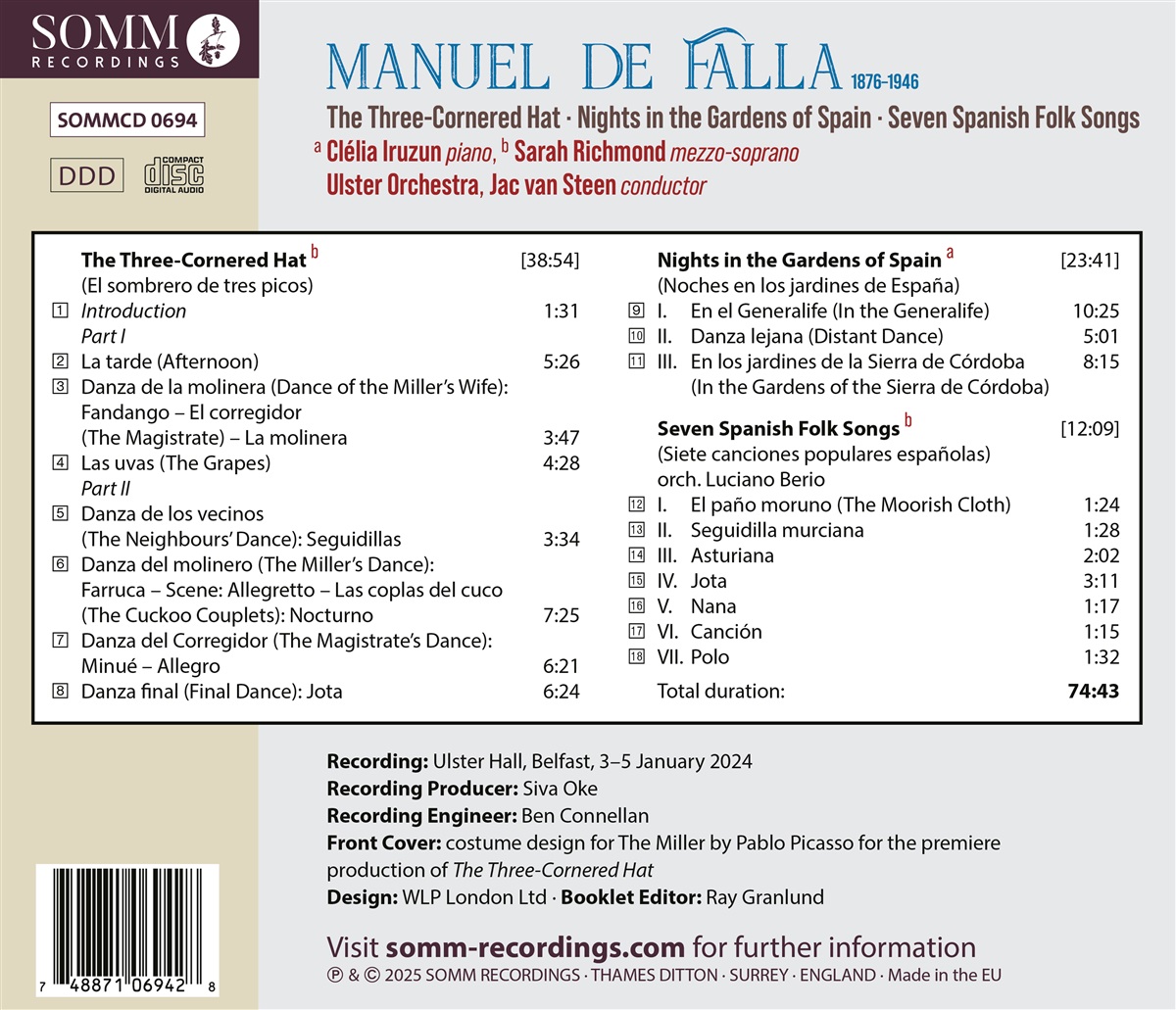 Diese Veröffentlichung ist dem spanischen Komponisten und Pianisten Manuel de Falla, gewidmet ist. Sie enthält drei spätromantische Partituren, die das Wesen Spaniens einfangen: „El sombrero de tres picos“, „Noches en los jardines de España“ und „Siete canciones populares españolas“. Vor dem Hintergrund des Ersten Weltkriegs erlangte Falla nicht nur in Spanien, sondern als Komponist mit wachsendem internationalem Ruf Ruhm und Anerkennung. Dieser Status wurde bestätigt, als Sergei Diaghilev das Ballett „El sombrero de tres picos“ für die Ballets Russes in Auftrag gab, das 1919 in London aufgeführt werden sollte, mit Bühnenbildern von Pablo Picasso. Das Ballett, wie auch der Roman von Pedro Antonio de Alarcón, der es inspirierte, enthält spanische Erzählungen, die das alltägliche Dorfleben heraufbeschwören, und Fallas Musik ist reich an Anklängen an traditionelle spanische Volksweisen. „Noches en los jardines de España“ ist eine dreisätzige Darstellung der Klänge und Sehenswürdigkeiten von Fallas Heimat Andalusien, die im Schutz der Dunkelheit magisch erscheinen. Nach der Uraufführung in Madrid im Jahr 1916 war Falla selbst der Solist bei der ersten Aufführung des Werks in London im Jahr 1921. Sowohl die Texte als auch die Melodien von „Siete canciones populares españolas“ waren traditionell, obwohl Fallas ursprüngliche Bearbeitung für Sopran und Klavier viel zur Wirkung dieser Lieder aus verschiedenen Regionen Spaniens beitrug. Dieses Werk ist eine von Fallas meistbearbeiteten Kompositionen; die hier orchestrierte Version stammt von Luciano Berio. Diese Aufnahme wurde vom Ulster Orchestra unter der Leitung seines Ersten Gastdirigenten Jac van Steen eingespielt. Die Solistin für „Noches en los jardines de España“ ist die in London lebende brasilianische Pianistin Clélia Iruzun, die zweifellos zu den besten Pianistinnen für südamerikanisches und iberisches Repertoire zählt, die derzeit in Europa auftreten, und der mehrere Komponisten Werke gewidmet haben. Die preisgekrönte irische Mezzosopranistin Sarah Richmond gibt mit „Siete canciones populares españolas“ ihr CD-Debüt.