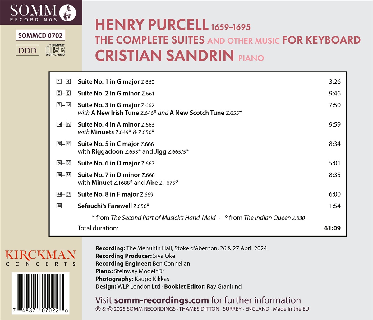 Dies ist die erste Aufnahme der acht Keyboard-Suiten von einem der größten kreativen Künstler Englands, Henry Purcell (1659–1695), auf dem Klavier. Henry Purcell schrieb für jede Form – von Theater und Kirche bis hin zu Konzerten und Bällen – und seine Musik dominierte die öffentliche Nachfrage in fast jedem Genre. Tragischerweise starb Purcell am 21. November 1695 auf dem Höhepunkt seiner Karriere in seinem Haus in London. Ein Jahr nach seinem Tod veröffentlichte Purcells Witwe Frances posthum „A Choice Collection of Lessons for the Harpsichord or Spinet“. Diese acht Suiten, die lange Zeit im Schatten seiner berühmteren Bühnenwerke standen, bilden den Kern von Purcells Kompositionen für Tasteninstrumente. Sie wechseln von Dur- zu Moll-Tonarten, von heiter zu ernst, und schaffen so eine einzigartig ausdrucksstarke musikalische Welt. Die Suiten enthalten französische Tanzformen wie Almand, Corante und Menuett sowie die spanische Sarabande, die Purcell mit einem typisch britischen Idiom durchtränkte. Dies kommt besonders in Sätzen wie einem Corante zum Ausdruck, der geschickt Melodien aus Irland und Schottland einfließen lässt, einem brillanten Jigg, der den Zuhörer unversehens zu fesseln scheint, und einer stämmigen Hornpipe, die auf frühere Bühnenmusik zurückgreift. Cristian Sandrin unterlegt Purcells posthum veröffentlichte acht Klaviersuiten mit gelegentlichen Ergänzungen aus anderen Werken, und sein Rezital endet mit dem wunderschönen Sefauchi's Farewell.