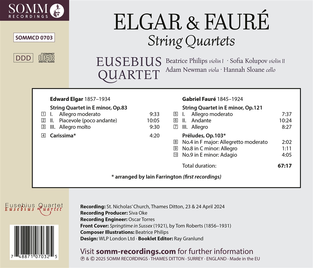 Das vorliegende Album des englischen Eusebius Quartett enthält eine ungewöhnliche, aber spannende Zusammenstellung von zwei Streichquartetten der britischen und französischen Zeitgenossen Edward Elgar (1857-1934) und Gabriel Fauré (1845-1924). Hinzu kommt eine Sammlung kürzerer Stücke, die der britische Komponist, Arrangeur und Pianist Iain Farrington für Streichquartett bearbeitet hat. Dazu gehören Elgars „Carissima“ (ursprünglich für kleines Orchester komponiert) und eine Auswahl aus Faurés Klavierpräludien: Nr. 4, 8 und 9.