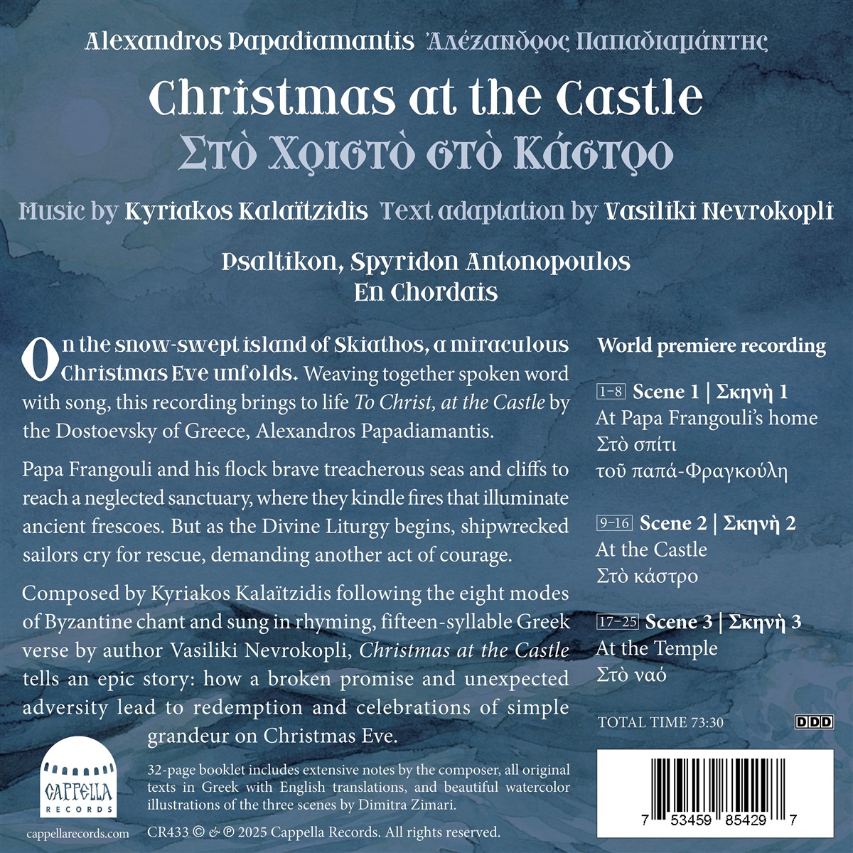 Auf der schneebedeckten Insel Skiathos ereignet sich ein wundersamer Heiligabend. Diese Aufnahme verbindet gesprochene Worte mit Gesang und erweckt „Christ at the Castle“ von Alexandros Papadiamantis, dem Dostojewski Griechenlands, zum Leben. Papa Frangouli und seine Gemeinde trotzen den tückischen Meeren und Klippen, um ein verlassenes Heiligtum zu erreichen, wo sie ein Feuer entfachen, das die alte Fresken beleuchtet. Doch als die Göttliche Liturgie beginnt, rufen schiffbrüchige Seeleute um Hilfe und es bedarf weiterer mutiger Taten. Komponiert von Kyriakos Kalaïtzidis nach den acht Modi des byzantinischen Gesangs und gesungen in gereimten, fünfzehnsilbigen griechischen Versen der Autorin Vasiliki Nevrokopli, erzählt „Christmas at the Castle“ eine epische Geschichte darüber, wie ein gebrochenes Versprechen und unerwartete Widrigkeiten zu Erlösung und einfachen, aber wundervollen Feierlichkeiten an Heiligabend führen. Das physische Produkt enthält ein 32-seitiges Booklet mit einem ausführlichen Essay, Fotografien und allen Texten im griechischen Original und in englischer Übersetzung sowie Anmerkungen des Komponisten.