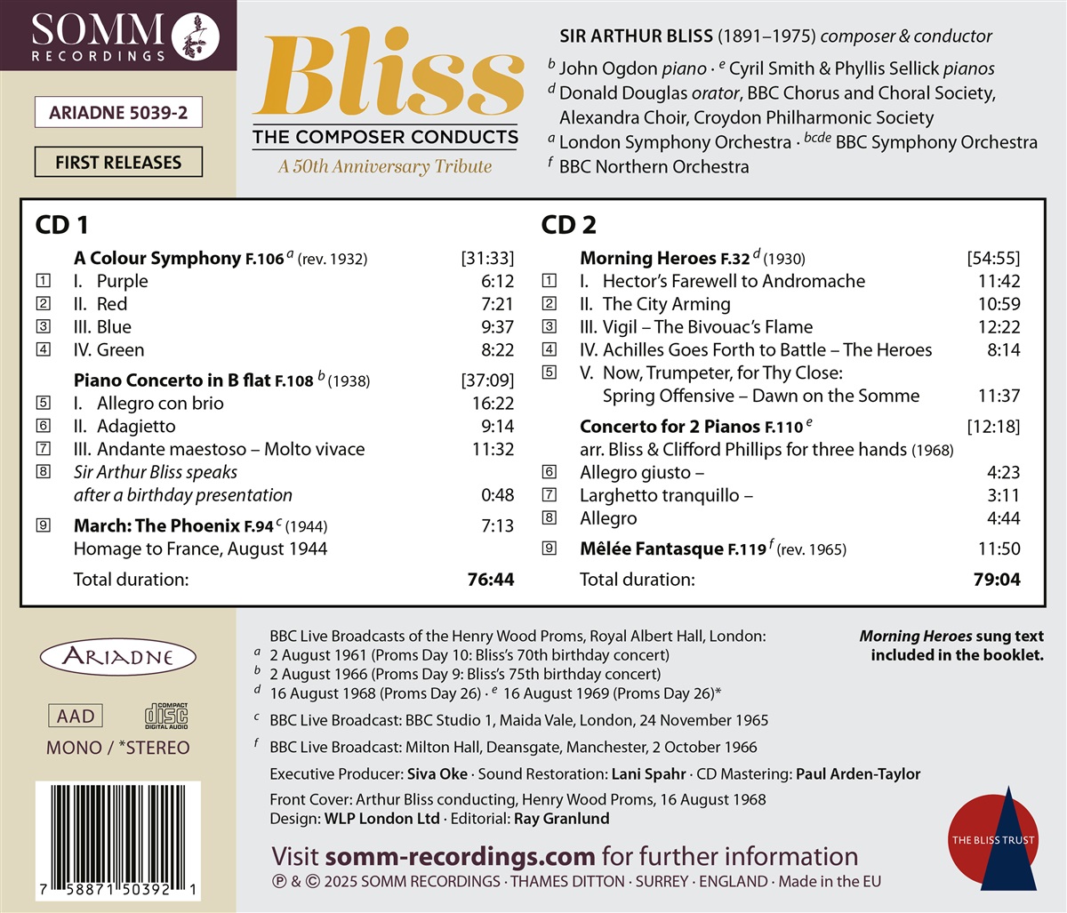 Sir Arthur Bliss war ein hervorragender Dirigent seiner eigenen Musik, hinterließ aber nur wenige kommerzielle Aufnahmen. Zum 50. Todestag erscheint dieses Doppelalbum mit wichtigen Archivaufnahmen, größtenteils von den BBC Proms stammend und bisher unveröffentlicht. Lani Spahr, dessen kürzlich erschienene 6-teilige Reihe „Bruckner from the Archives“ vom Gramophone Magazine mit zwei Editor's Choices ausgezeichnet wurde, remasterte die Originale. Zu hören sind ganz unterschiedliche Werke wie „A Colour Symphony“, das Bliss 1920 für das Three Choirs Festival komponierte. Inspiriert von einem Buch über Heraldik komponierte er eine vollwertige Sinfonie, die symbolische Bedeutungen der Primärfarben einbezieht. Die hier veröffentlichte Aufnahme stammt aus dem Konzert zu Bliss' 70. Geburtstag bei den Proms 1961. Bliss und sein jüngerer Bruder dienten im Ersten Weltkrieg, und Kennard fiel in der Schlacht an der Somme. 1930, verfolgt von Alpträumen über den Krieg und Trauer um seinen Bruder, komponierte Bliss „Morning Heroes“ und widmete es ihm und den im Kampf gefallenen Kameraden. Das Werk ist eine Sinfonie für Sprecher, Chor und Orchester mit Texten aus „Die Ilias“, Walt Whitman und Wilfred Owen. Das vielfach überarbeitete „Concerto for Two Pianos“ wird in einer Fassung für zwei Klaviere und drei Hände präsentiert, die Bliss arrangierte, nachdem Cyril Smith einen Schlaganfall erlitten hatte, der seinen linken Arm lähmte. Diese Aufführung mit Bliss, Cyril Smith, Phyllis Sellick und dem BBC Symphony Orchestra stammt aus den Proms von 1969. Sein Klavierkonzert, der Marsch „The Phoenix“ und der Vorläufer vieler Ballettmusiken, die später folgen sollten, „Mêlée Fantasque“, runden die Zusammenstellung ab.