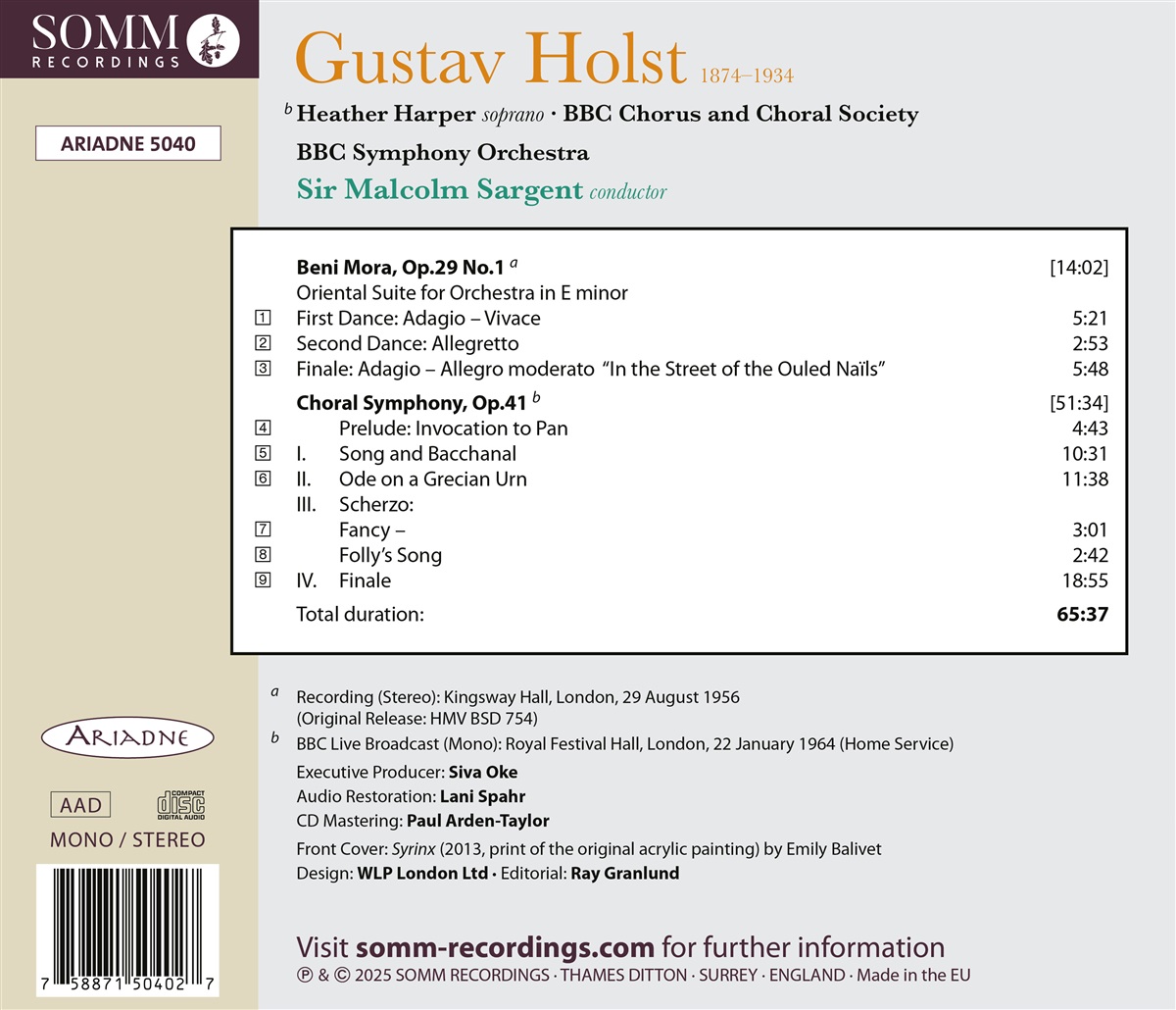 Dieses Album ist ein weiterer Teil in der Reihe zur Feier des 150. Geburtstags von Gustav Holst. Nach nie zuvor veröffentlichten Live-Aufnahmen aus den 40er-, 50er- und 60er-Jahren, die in sorgfältigen Restaurierungen herausgegeben wurden, enthält dieser Teil „Beni Mora“ aus dem Jahr 1956 und eine BBC-Live-Übertragung der „Choral Symphony“ aus dem Jahr 1964, beide unter der Leitung eines der bedeutendsten Dirigenten seiner Zeit und Spezialisten für das britische Repertoire, Sir Malcolm Sargent, und gespielt vom BBC Symphony Orchestra. Holsts „Die Planeten“ ist eine zu Recht bekannte Suite, aber die große Originalität und das Können seines Schreibens werden immer noch weitgehend unterschätzt. Während eines Aufenthalts in Algier im Jahr 1908 hörte Holst einen einheimischen Musiker, der zwei Stunden lang auf einer Bambusflöte immer wieder dieselbe Phrase spielte. Diese Melodie wurde zur Grundlage für den Schlusssatz von „Beni Mora“, in dem Holst die achttönige Melodie 163 Mal wiederholt, und damit den Minimalismus vorwegnahm. Nach dem Erfolg von „The Planets“ erhielt Holst 1925 einen Auftrag vom Leeds Triennial Festival und überarbeitete dafür den Entwurf seiner „Choral Symphony“ – er ließ sich dazu von Gedichtsammlung von John Keats inspirieren.