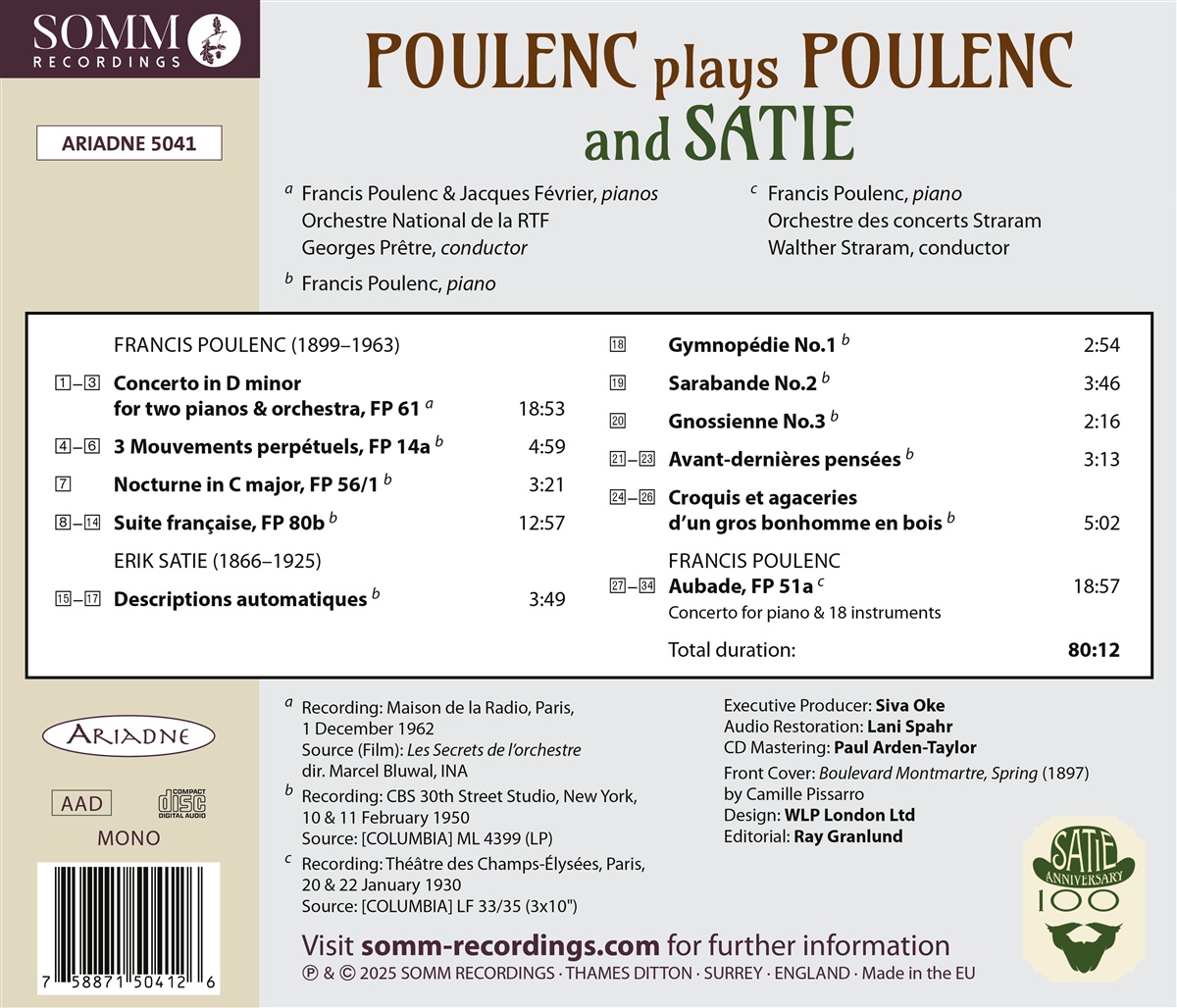 Dieses Album stellt die pianistische Meisterschaft von Francis Poulenc (1899 - 1963) mit einer Reihe außergewöhnlicher historischer Aufnahmen heraus, darunter zwei seiner vier großen konzertanten Werke und ausgewählte Soloklavierstücke. Anlässlich des 100. Todestages von Erik Satie (1866 - 1925) spielte Poulenc für diese Aufnahme auch Klavierperlen von Satie, dessen Abneigung gegen akademische Routine und Romantik Poulenc und die anderen Mitglieder der Groupe Les Six tiefgreifend beeinflusste. Diese Mitschnitte aus den Jahren 1930 bis 1950 wurden für die Wiederveröffentlichung neu gemastert.