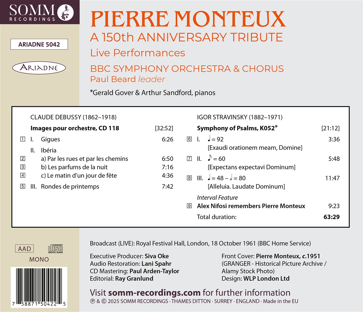 Diese Aufnahme feiern den 150. Geburtstag des großen französisch-amerikanischen Dirigenten Pierre Monteux (1875–1964) mit seinen Live-Aufführungen von Claude Debussys „Images pour orchestre“ und Igor Strawinskys „Psalmensymphonie“. Diese Aufnahmen aus dem Jahr 1961 mit dem BBC Symphony Orchestra & Chorus wurden von Lani Spahr, dessen Audio-Restaurierungen von Gramophone, BBC Radio 3, The Sunday Times und vielen anderen hoch gelobt wurden, hervorragend remastered. Monteuxs Tod liegt 61 Jahre zurück – noch nicht so lange, dass er für viele heutige Musikliebhaber längst Geschichte ist. Er stand mit beiden Komponisten dieser Aufnahme in beruflicher Verbindung. Anfang der 1910er Jahre galt Monteux als führender französischer Dirigent der jüngeren Generation, und Debussy wählte ihn für die Vorbereitung der Weltpremiere von „Images pour orchestre“, die Debussy selbst im Januar 1913 dirigierte. Monteux' erste Dirigentenstelle war beim Pariser Colonne-Orchester, das Sergei Diaghilev für die Saison 1910 der Ballets Russes engagierte, dort spielte er Viola bei der Uraufführung von „Der Feuervogel“ und dirigierte später auf Wunsch Strawinskys die Uraufführung von „Petruschka“ und leitete die berühmt-berüchtigte erste Aufführung von „Le Sacre du printemps“. Nach kurzem Intermezzo beim Militärdienst, dirigerte er wieder die Ballets Russes und wurde anschließend Chefdirigent des Boston Symphony Orchestra. Sein Nachfolger dort war der russische Maestro Serge Koussevitzky, der 1931 eine Reihe führender Komponisten – darunter Strawinsky – beauftragte, Werke zum 50-jährigen Jubiläum des BSO zu schreiben. Strawinskys Beitrag war seine „Psalmensymonie“ für Chor und Orchester. Das in neoklassizistischem Stil komponierte Werk mit Anklängen an Bachs Oratorien ist eines der großen Chorwerke des 20. Jahrhunderts. Diese Live-Aufnahmen aus Monteux' Spätwerk werden ergänzt durch eine Hommage an Pierre Monteux von dem Geiger Alex Nifosi.