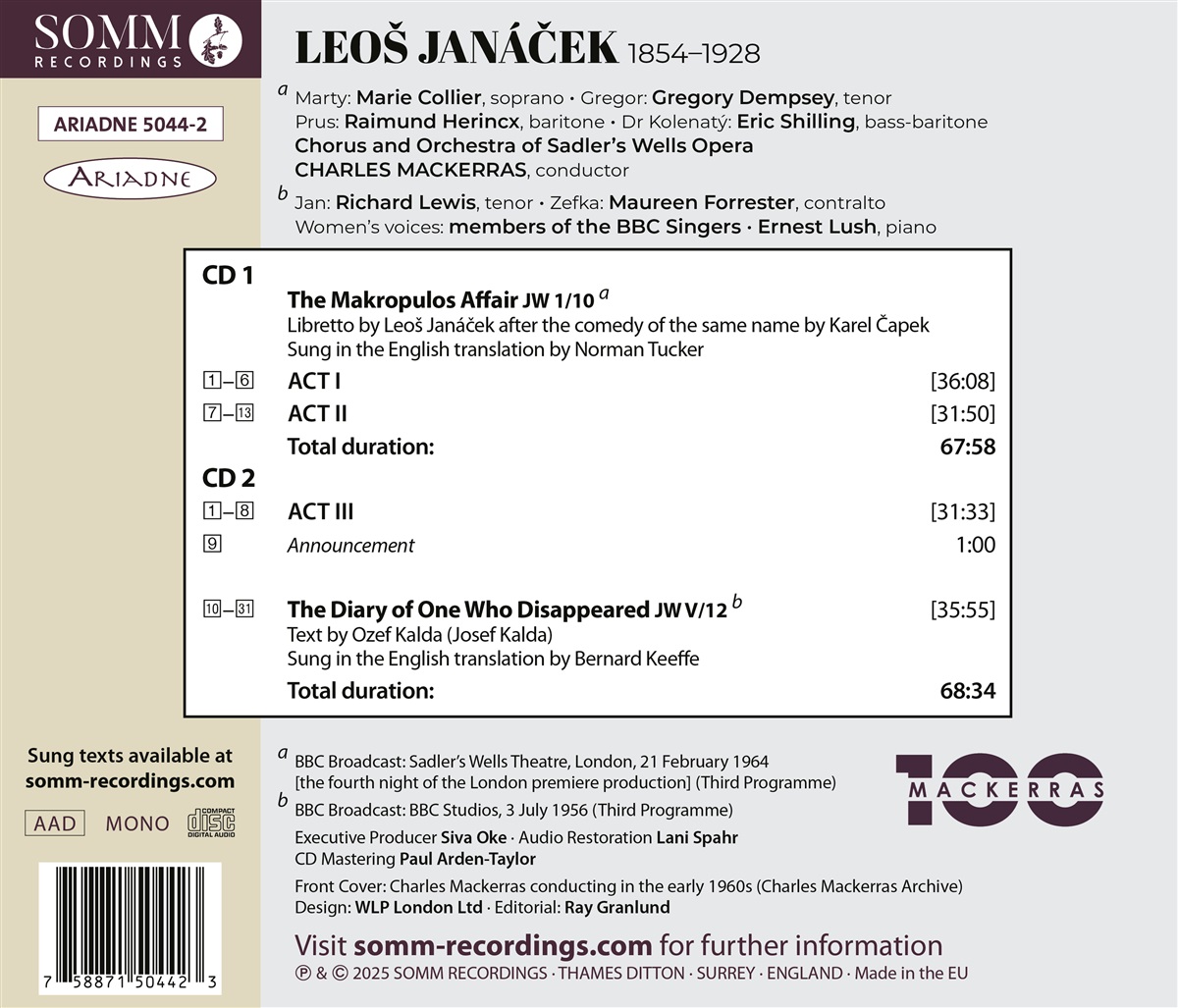 Diese Veröffentlichung ist eine besondere Hommage an Sir Charles Mackerras (1925–2010), der neben anderen herausragenden Leistungen ein hervorragender Interpret der Musik des tschechischen Komponisten Leoš Janáček (1854–1928) war, dessen Musik er über sechs Jahrzehnte hinweg in Großbritannien bekannt machte. Enthalten ist die Veröffentlichung einer remasterten Aufzeichnung aus dem Jahr 1964 von Mackerras' erster Londoner Inszenierung der Oper „Die Sache Makropulos“ sowie Janáčeks quasi-opernhafter Liederzyklus „Tagebuch eines Verschollenen“. Die Audio-Restaurierung stammt von Lani Spahr, dessen frühere Restaurierungen von Werken von Edward Elgar, Anton Bruckner, Gustav Holst und Arthur Bliss kürzlich nicht weniger als drei Gramophone Editor's Choices erhielten. Charles Mackerras‘ Durchbruch bei der Einführung der unbekannten Musik Janáčeks beim britischen Publikum gelang ihm im Februar 1964, als er „Die Sache Makropulos“ im Sadler’s Wells dirigierte. Diese Veröffentlichung ist eine spannende, emotionsgeladene Erinnerung an diese erste Londoner Produktion. Die Aufnahme präsentiert die australische dramatische Sopranistin Marie Collier, eine herausragende Interpretin dieser Rolle. Die Gesangspartien in der Oper sind überwiegend dialogisch, untermalt von einer Orchestermusik, die sowohl kompromisslos modern ist als auch an alte Zeiten erinnert. Das „Tagebuch eines Verschollenen“, begann Janáček 1917 zu komponieren, einen Monat nachdem er die fast 40 Jahre jüngere Kamila Stösslová kennengelernt hatte, in die er sich verliebte, obwohl beide verheiratet waren. Dieser unorthodoxe Liederzyklus für Tenor, Alt, Frauenstimmen und Klavier wurde von einem Tagebuch in Gedichtform inspiriert, das von einem Dorfjungen handelt, der sich in das Mädchen Žofka verliebt. in dieser Aufnahme aus dem Jahr 1956 singen Richard Lewis (Tenor), Maureen Forrester (Alt), Sängerinnen der BBC Singers und es spielt der Pianist Ernest Lush.