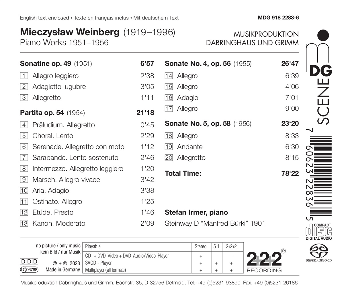 Der in Paderborn geborene Pianist Stefan Irmer begibt sich auf diesem Album auf eine aufregende Spurensuche tief in der Musik (und der tragischen Geschichte) des 20. Jahrhunderts und präsentiert Mieczys?aw Weinbergs anspruchsvolle Klaviermusik als intensives, unmittelbar anrührendes Erlebnis. Im Mittelpunkt seiner Betrachtungen stehen Weinbergs Klavierwerke, die zwischen 1951 und 1956 entstanden: die Sonatine op. 49, die Partita op. 54 und beiden sinfonisch ausladenden Sonaten Nr. 4 op. 56 und Nr. 5 op. 58. Der prachtvolle Steinway „Manfred Bürki“ von 1901, auf dem die Stücke eingespielt wurden, lässt Weinbergs suggestive Musik grandios erklingen.