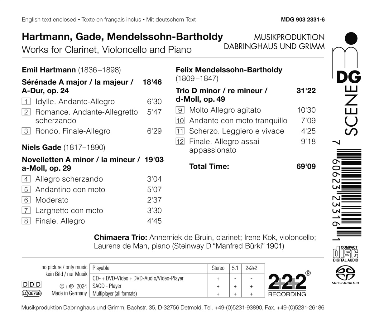 Ein nordisch-romantisches Spiel um Sagen und Mythen, um Assoziationen und Anspielungen präsentiert das Chimaera Trio auf seiner neuesten Super Audio CD-Einspielung. Die Trios von Mendelssohn, seinem engen Freund und geschätzten Kollegen Niels Wilhelm Gade und dessen Schwager Emil Hartmann sind weit mehr als ein Spiegel inniger Freundschafts- und Familienbande; der Blick weitet sich in einen schier unendlichen Kosmos, in dem alles mit allem verwoben ist. Gades „Novelletten“ tragen das Erzählende schon im Titel. Unüberhörbar, dass Schumann Pate stand. Wovon die kleinen Erzählungen handeln, bleibt jedoch der Fantasie des Zuhörers vorbehalten. Ob es die „Märchen und Legenden, die ihn auf seinen Knabenreisen begleiteten“ sind, wie Robert Schumann vermutete? Sind die Novelletten ebenso wie Mendelssohns Trio passend für das Chimaera Trio bearbeitet, handelt es sich bei Hartmanns „Serenade“ um eine Originalkomposition für Klarinette, Cello und Klavier. „Idylle, Romance, Rondo“ sind die drei Teile betitelt, die Erinnerungen an Erlebtes, Gehörtes und Fantasiertes wecken. Außergewöhnlich auffällig sind die Verschränkungen zwischen der Serenade und Mendelssohns Trio op. 49. Motivverwandschaften finden sich aber auch zu Schubert und Schumann, den dieses Trio zum Bonmot über Mendelssohn als den „Mozart des 19. Jahrhunderts“ inspirierte. Mit unbeschwerter Leichtigkeit taucht das Chimaera Trio ein in die stupende Welt aus Kobolden und Elfen, Geistern und Fabelwesen – im wahrsten Sinne märchenhaft!