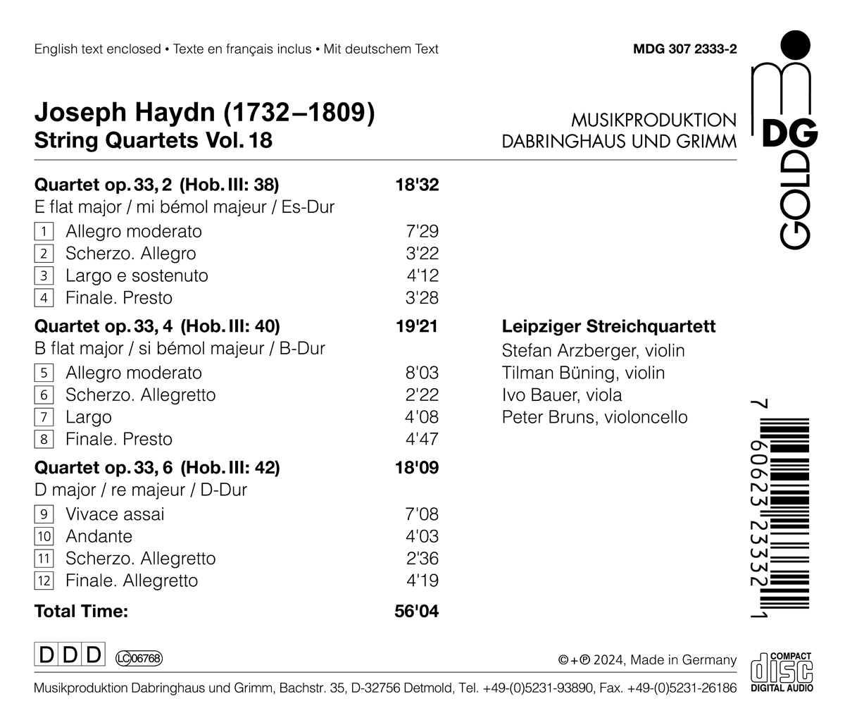 „… auf eine gantz neu besondere Art“ - so annoncierte Joseph Haydn seine Streichquartette op. 33. Und genauso könnte man auch die Neueinspielung durch das Leipziger Streichquartett charakterisieren: Haydns Originalität, Witz und Esprit erstaunen wieder einmal - ebenso der frappante Einfallsreichtum in der Wiedergabe des vielseitigen Spitzenensembles. Mit op. 33 hatte Haydn erstmals die Gelegenheit, seine „Erfindung“ des Streichquartetts am freien Markt anzubieten – den Liebhabern zur Subskription, den Verlagen zum Druck. Die Nachfrage (und damit die wirtschaftliche Erwartung) war so groß, dass eine unabgesprochene Vorankündigung durch den Verlag zu Missstimmung zwischen Komponisten und Herausgeber führte; Verleger Artaria gab schließlich dem berühmten Tonsetzer nach. Zehn Jahre nach den Quartetten op. 20 hatte sich Haydns Kompositionstechnik rasant entwickelt. Größtmöglicher Effekt wird nun mit erstaunlich sparsamen Mitteln erreicht; oftmals gibt es nur ein Thema, und winzigste Motivpartikel werden virtuos weiter verarbeitet. Gegenüber der Ersten Violine emanzipieren sich die tieferen Stimmen zunehmend. Besonders schön ist das in den langsamen Sätzen zu beobachten. Dabei spielt der Komponist immer wieder sehr raffiniert mit den Erwartungen seines Publikums, Überraschung garantiert!