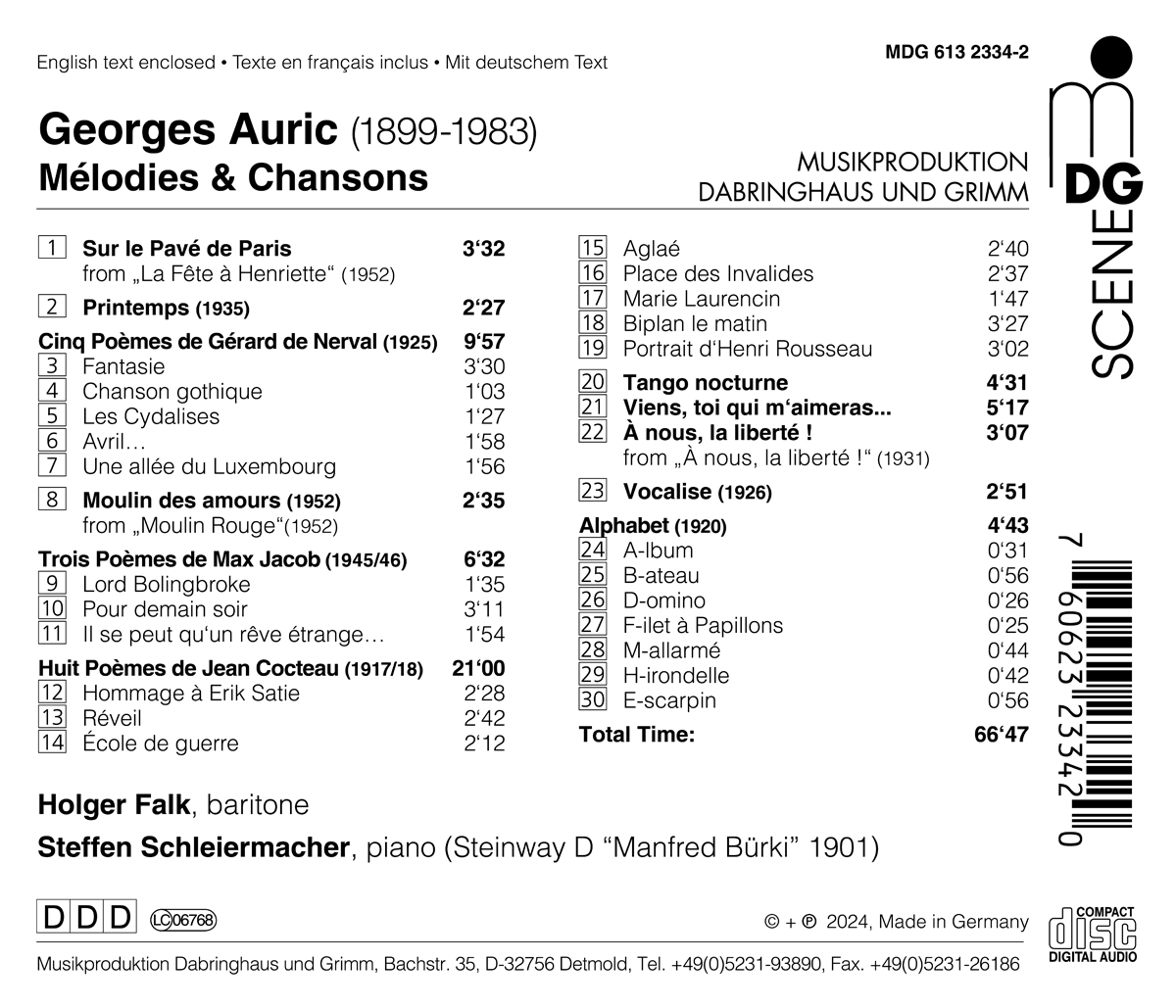 „Der Glöckner von Notre Dame“, „Moulin Rouge“ oder „Lohn der Angst“ – zu diesen und an die 250 weiteren filmischen Meisterwerken lieferte Georges Auric die Musik. In Konzertsälen hört man seine Kompositionen heute nur noch selten. Umso verdienstvoller die Auswahl an Liedern und Chansons, die Holger Falk und Steffen Schleiermacher in der Reihe ihrer Anthologien der „Groupe des Six“ nun präsentieren. So ein Schlager wie „Moulin des amours“, zu dem Zsa Zsa Gabor einst die Lippen bewegte, darf natürlich nicht fehlen, aber auch die drei Chansons aus der umwerfenden Komödie „Á nous, la liberté!“ (deutscher Titel: „Es lebe die Freiheit!“) von René Clair zeigen Aurics sicheres Gespür für mitreißende Melodien. Auric konnte allerdings auch ganz anders: Ob bürgerschrecklich-provokant wie in den „Huit Poèmes de Jean Cocteau“, romantisch-zart wie die „Cinq Poèmes de Gerard de Nerval“ oder mit lautengleichen Renaissanceanklängen wie „Printemps“ nach Pierre de Ronsard – schier unerschöpflich scheint Aurics stilistische Wandlungsfähigkeit. Holger Falk ist schlichtweg die Idealbesetzung für ein derart facettenreiches Programm. Sein ungemein beweglicher, bis in die Höhe leichtgängiger Bariton wird von Steffen Schleiermacher einmal mehr einfühlsam bis schwungvoll, zuweilen auch virtuos begleitet.