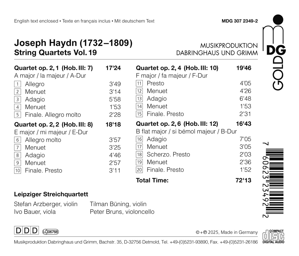 An Überraschungen mangelt es nie, wenn Joseph Haydn ins Spiel kommt. Und so bietet auch die jüngste Folge der bereits zum Standard gewordenen Gesamteinspielung aller Streichquartette des Leipziger Streichquartetts mit den vier Werken aus Opus 2 unerwartete, ungewöhnliche und stets unterhaltsame Momente, virtuos und souverän dargeboten von einem Ensemble, das Neugierde und Erfahrung zu einem reizvollen Ganzen verbindet. Haydn hatte seine Stellung bei Fürst Esterhazy noch nicht angetreten, als er die vier Quartette schuf, die heute als op. 2 bezeichnet werden. Vorbild ist das populäre Divertimento mit einer idyllischen Serenade als Höhepunkt und Zentrum der Komposition, die Primarius Stefan Arzberger Gelegenheit gibt, betörende Kantilenen und bezaubernde Arabesken zu gestalten. Eingerahmt werden diese filigranen Wunderwerke von jeweils zwei Menuetten, deren Trios Raum geben für Klangfarbenexperimente und Raffinessen. Kopfsatz und Finale lassen bereits die klassische Sonatenform anklingen; mit frischem Tempo bilden sie einen mitreißenden, virtuos gestalteten Rahmen Nur das letzte der vier Quartette weicht von der Konvention ab: Auf das ausgedehnte Adagio mit Variationen zu Beginn folgen vier schnelle, individuell gestaltete Sätze mit einem als „Scherzo“ bezeichneten Abschnitt in der Mitte. Der Einfallsreichtum und die Genialität des Komponisten, um dessen Werke Jahrzehnte später die gesamte europäische Elite riss, sind in der Aufführung des Leipziger Streichquartetts auch für heutige Ohren unverkennbar.