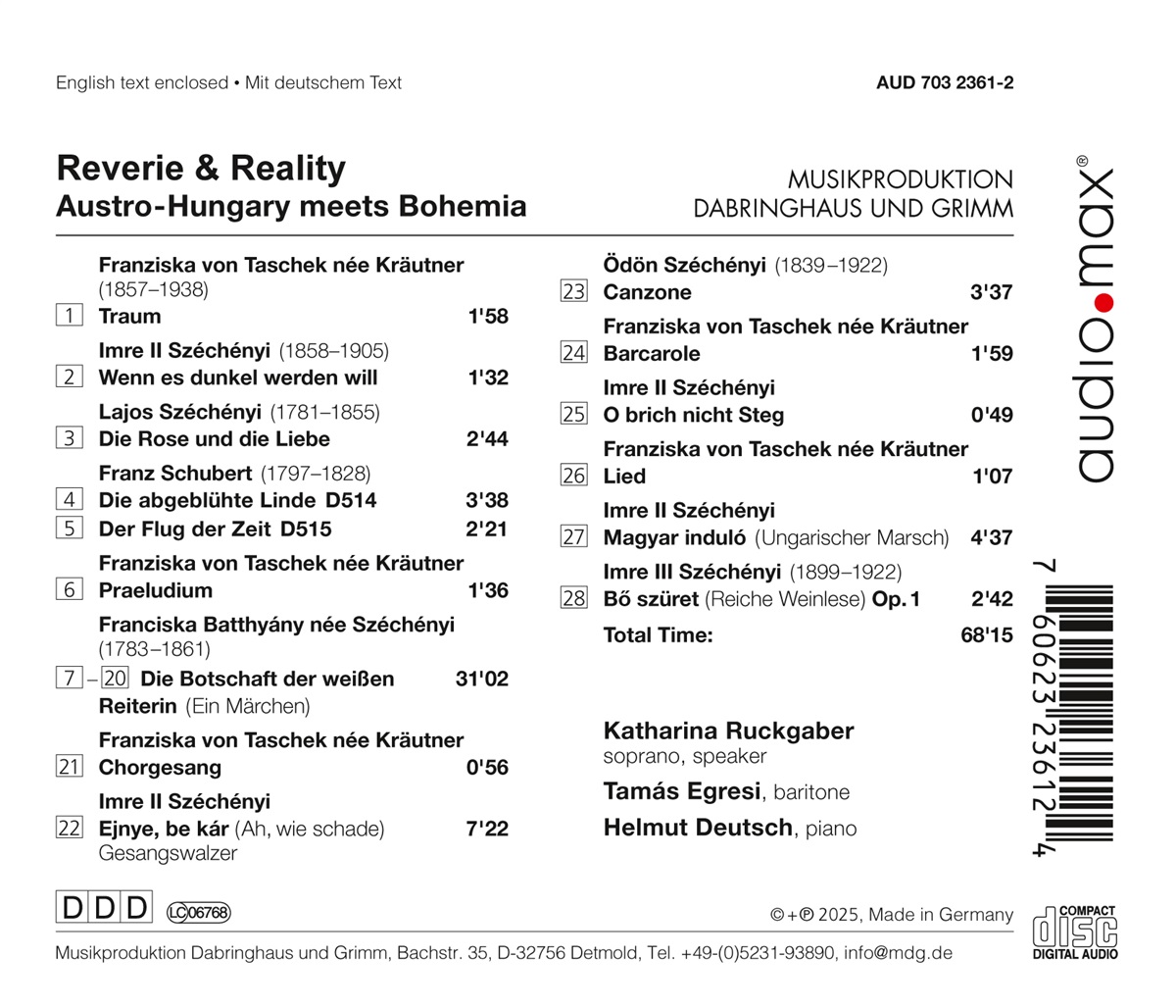 Ein Familientreffen der besonderen Art: Die Familie der Grafen Széchényi hat über Generationen hinweg die Geschicke Ungarns maßgeblich mitbestimmt und dabei auch den kulturellen Austausch gepflegt. Die Mitglieder der Familie waren auch selbst schöpferisch tätig: Aus dem großen Repertoire an Dichtungen und Kompositionen haben Katharina Ruckgaber und Tamás Egresi eine repräsentative Auswahl an Liedern zusammengestellt, begleitet von Helmut Deutsch am Klavier. Dabei stößt man auf einige überraschende Zusammenhänge: Der 20-jährige Franz Schubert komponierte „Die abgeblühte Linde“ und „Der Flug der Zeit“ auf Texte von Lajos Széchényi. Dass Lajos zudem später Widmungsträger von Schuberts Lied „Der Tod und das Mädchen“ wurde, zeigt die große Wertschätzung für das kulturelle Engagement der Familie. Kurioses ist auch dabei, so ein Lied des erst 10- jährigen Imre III Széchényi, der im Ersten Weltkrieg kämpfte und bereits mit 23 Jahren an den Folgen der Diphtherie starb. Franciska Széchényi wiederum gilt als die erste Komponistin Ungarns - die tief religiöse Frau hinterließ vor allem als Wohltäterin ihre Spuren. Auf ihr Leben dichtete der erst kürzlich verstorbene Rudolf Marko, ebenfalls Mitglied der Familie, das Stück „Botschaft der weißen Reiterin“, das Katharina Ruckgaber abwechselnd mit Liedern von Franciska vorträgt. Auch wenn viele Kompositionen der Familie Széchényi nicht auffindbar sind: Die Zusammenstellung ist ein eindrucksvolles Zeugnis für die vielfältigen Interessen und Talente einer der bedeutendsten europäischen Adelsfamilien.