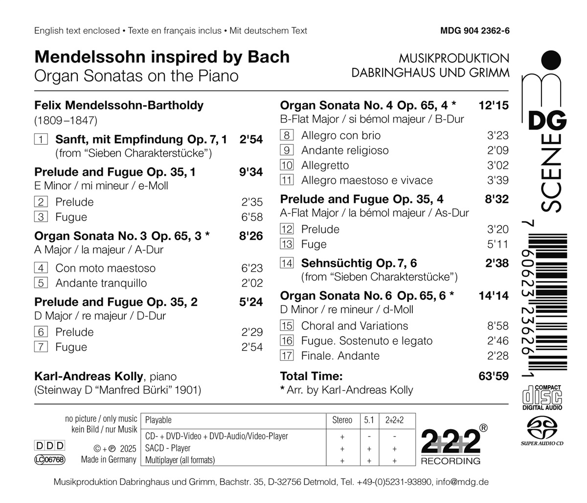Dass Felix Mendelssohn Bartholdy ein für seine Zeit außergewöhnliches Interesse an den Werken Bachs zeigte, belegt eindrucksvoll die legendäre Aufführung der Matthäuspassion, die der Romantiker dem Geschmack seiner Generation gemäß neu instrumentierte. Karl-Andreas Kolly begibt sich auf Spurensuche nach Bach in Mendelssohns Klavierwerken und entdeckt eine tiefe Verbindung in seinen eigenen Transkriptionen dreier Orgelsonaten, die den Komponisten der emotionalen „Lieder ohne Worte“ in einem völlig neuen Licht erscheinen lassen. Die drei Sonaten in Kollys Bearbeitung wirken erstaunlich pianistisch; die dynamische Flexibilität und Präzision der Artikulation sorgen für einen luftigen Klang, der die polyphonen Strukturen plastisch hervortreten lässt. Die großen Variationen über Luthers Choral „Vater unser im Himmelreich“ gewinnen im Kopfsatz der sechsten Sonate an eindringlicher Intensität. Zu den drei Sonaten gesellt Kolly drei Präludien und Fugen, die schon dem Titel nach an Bach erinnern. Die selten gehörten Klavierwerke werden ergänzt durch zwei echt romantische Charakterstücke aus op. 7, deren erstes „Sehnsüchtig“ ganz offensichtlich eine Sarabande aus Bachs „Französischen Suiten“ paraphrasiert – ein weiterer Beleg für die Nähe dieser sonst so unterschiedlichen Musikepochen. Der satte Klang des Steinway-Konzertflügels ‚Manfred Bürki‘ aus dem Jahr 1901 tut ein Übriges. Mit Oktavverdoppelungen und geschickter Stimmführung gelingt es Kolly, einen großen Obertonreichtum bei gleichzeitig fülliger Tiefe zu erzeugen, die die Reduktion auf nur zwei Hände zu keiner Zeit als Beschränkung erleben lässt.
