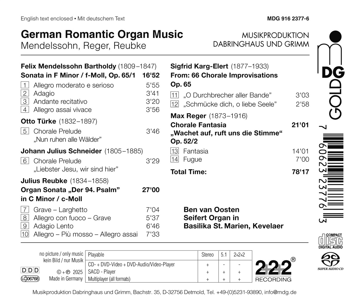 Das vorliegende Album zeichnet die Entwicklung der romantischen Orgelmusik in Deutschland von Felix Mendelssohn über Otto Türke, Johann Julius Schneider, Julius Reubke, Sigfrid Karg-Elert bis zu Max Reger nach. Ben van Oosten spielt auf der Seifert-Orgel in der Basilika St. Marien im Wallfahrtsort Kevelaer am Niederrhein.
