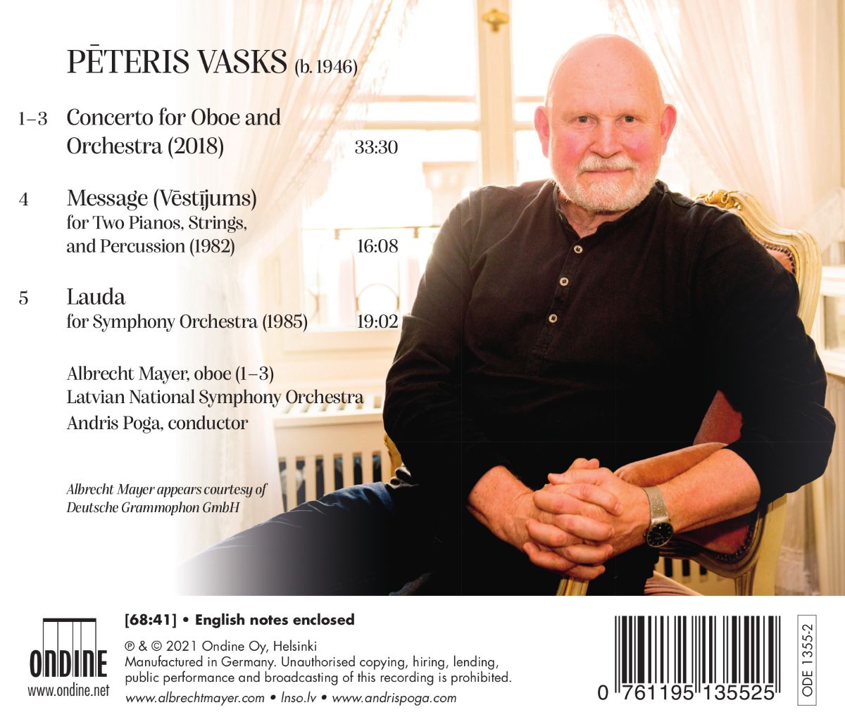 Für die Weltersteinspielung des 2018 entstandenen Oboenkonzerts des lettischen Komponisten P?teris Vasks konnte das Lettische Nationalorchester unter der Leitung von Andris Poga einen Solisten von Weltruhm gewinnen: Albrecht Mayer, seines Zeichen weltweit gefeierter Virtuose und Solo-Oboist der Berliner Philharmoniker. Mayer war es auch, der das Werk in derselben Besetzung im Oktober 2018 anlässlich der 100-jährigen Unabhängigkeitsfeierlichkeiten Lettlands in Riga uraufführte. Das pastorale Konzert gehört zu Vasks ‚leichteren‘ Werken und lässt immer wieder Spuren lettischer Volksmusiken erahnen.