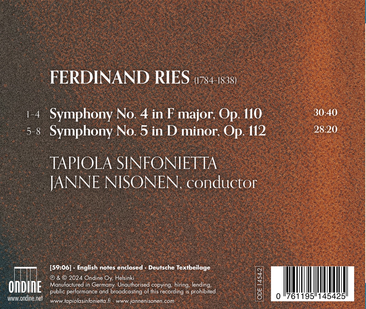 Dies ist der zweite Teil des laufenden Projekts eines vollständigen Sinfoniezyklus von Ferdinand Ries (1784–1838) durch die Tapiola Sinfonietta und den Dirigenten Janne Nisonen. Er enthält die Sinfonien Nr. 4 und 5 des Komponisten. In der Musikgeschichte oft als Beethovens „rechte Hand“ bezeichnet, offenbaren diese neuen Aufnahmen der Tapiola Sinfonietta einen bedeutenden Sinfoniker. Die erste Folge der Reihe erhielt hervorragende Kritiken in der deutschen Musikpresse. Obwohl sie als fünfte Sinfonie des Komponisten gezählt wird, stammt die d-Moll-Sinfonie aus dem Jahr 1813 und war die zweite Sinfonie des Komponisten, die vollendet wurde. Die Sinfonie war Ferdinand Ries' Einstand bei der London Philharmonic Society, die in den nächsten elf Jahren einen wichtigen Einfluss auf Ries' Karriere haben sollte, nachdem er sich in der Stadt niedergelassen hatte. Die Uraufführung der Sinfonie war ein großer Erfolg. Ries' Sinfonie in F-Dur Nr. 4, op. 110, wurde 1818 in London komponiert und wie op. 112 1823 in Leipzig bei Breitkopf und Härtel veröffentlicht. Aus ungeklärten Gründen war die Sinfonie nicht so erfolgreich wie seine 5. Sinfonie. Im heutigen Kontext erweist sich Ries in diesem Werk als ein Sinfoniker, der das Lob, das ihm nach der Uraufführung von op. 112 fünf Jahre zuvor zuteil wurde, durchaus verdient.