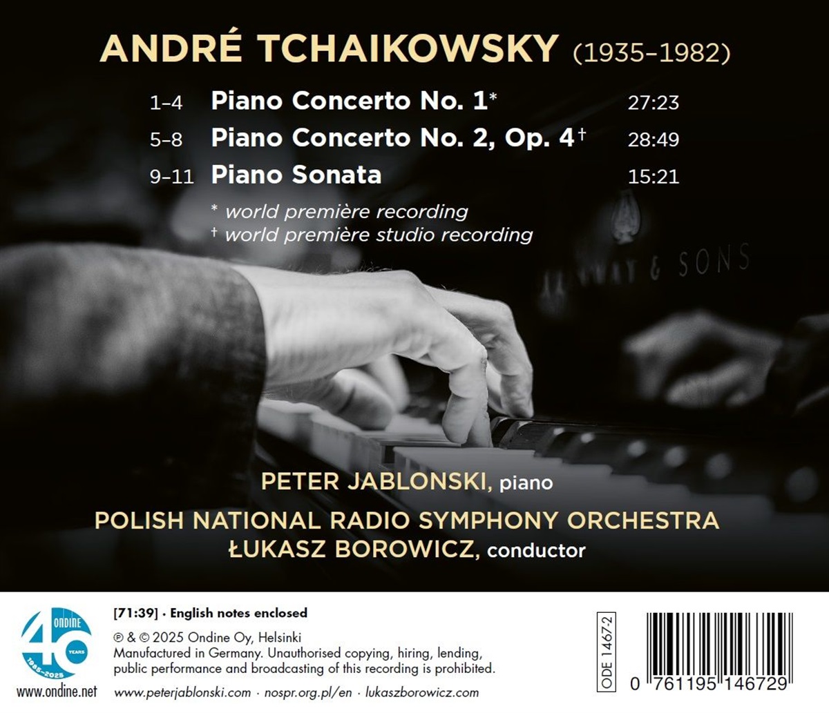 Dieses neue Album des Pianisten Peter Jablonski und des Polnischen Nationalen Rundfunk-Sinfonieorchesters unter Łukasz Borowicz enthält die Weltpremiere von André Tchaikowskys 1. Klavierkonzert und die erste Studioaufnahme des 2. Klavierkonzerts des Komponisten sowie seine Klaviersonate. Der in Polen geborene britische Pianist und Komponist André Tchaikowsky studierte Komposition in Warschau und Paris, doch es war seine Karriere als Konzertpianist, die ihm schließlich einen Namen in der Musikwelt einbrachte. Obwohl das Komponieren stets Tchaikowskys größte Leidenschaft blieb, wurde seine Musik nur selten aufgeführt. Sein Prokofjew-inspiriertes 1. Klavierkonzert wurde 1957 fertiggestellt und entstand unter dem Einfluss seines Mentors Arthur Rubinstein. Die Uraufführung des Werks in Belgien im Jahr 1957 war ein großes Ereignis. Tschaikowskys 2. Klavierkonzert, Op. 4, wurde im Oktober 1975 von Radu Lupu und dem Royal Philharmonic Orchestra. Inspiriert von einem Theaterstück von Ibsen, ist dieses emotionsgeladene Konzert ein kraftvolles, komplexes und außerordentlich schwieriges Werk im Geiste von Alban Berg und Béla Bartók und wurde von Kritikern, als eines der bemerkenswertesten Klavierkonzerte gepriesen, die je geschrieben wurden. Peter Jablonski ist ein preisgekrönter schwedischer Pianist. Er gehört zu den führenden Pianisten seiner Generation und hat in den letzten dreißig Jahren auf internationalen Bühnen mit über 150 Orchestern gespielt, über 2000 Konzerte gegeben und mehr als 30 Tourneen durch Japan unternommen. Seit seiner Gründung im Jahr 1935 hat das Polnische Nationalradio-Sinfonieorchester in Katowice seinen internationalen Ruf kontinuierlich ausgebaut, indem es in den renommiertesten Konzertsälen der Welt auftrat und mit den größten Künstlern unserer Zeit zusammenarbeitete, darunter Leonard Bernstein, Martha Argerich und Artur Rubinstein. Der Dirigent Łukasz Borowicz leitet regelmäßig die großen europäischen Orchester. Für seine über 130 Aufnahmen wurde er mit zahlreichen Preisen ausgezeichnet.