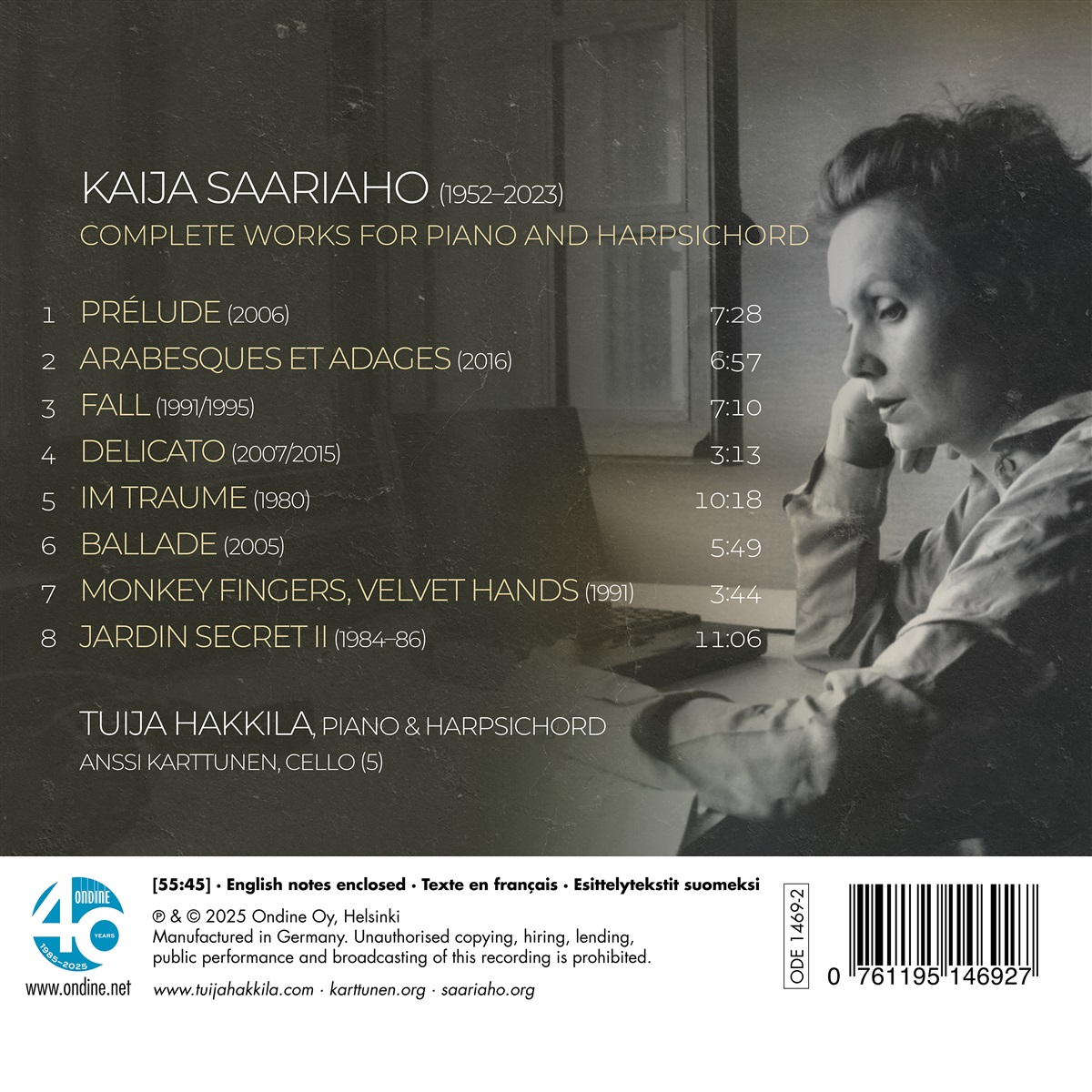 Die Pianistin Tuija Hakkila verband eine enge Freundschaft mit der Komponistin Kaija Saariaho (1952–2023), die über 40 Jahre bis zum Tod der Komponistin im Jahr 2023 andauerte. Hakkila spielte eine entscheidende Rolle in Saariahos Schaffen für Soloklavier und Cembalo. Saariaho empfand das Schreiben von Musik für Soloklavier aufgrund der Einschränkungen des Instruments als besonders herausfordernd, was sie nicht daran hinderte, einige Werke für Klavier zu komponieren. Obwohl es nur wenige sind, sind diese Werke Juwelen des 21. Jahrhunderts, die den von Debussys Spätwerken und Messiaen eingeschlagenen Weg fortsetzen. Tuija Hakkila hat eine leitende Position im Bereich Klaviermusik an der Sibelius-Akademie inne und erwarb 2005 einen Doktortitel in Musik. Ihr Repertoire reicht von Bach bis zur zeitgenössischen Musik. Ihr Interesse an der historischen Aufführungspraxis ist groß und sie präsentiert klassische und romantische Programme gerne auf historischen Klavieren. Sie arbeitet mit einer Reihe zeitgenössischer Komponisten zusammen und wird eingeladen, Uraufführungen neuer Werke zu spielen. Hakkilas Diskografie als Solistin umfasst den vollständigen Zyklus der Klaviersonaten von Wolfgang Amadeus Mozart, eine Zusammenstellung der Klavierwerke von Jean Sibelius, ein Rezital mit Klaviermusik des 20. Jahrhunderts und eine Weltersteinspielung der Musik der finnischen Brüder Lithander aus dem frühen 19. Jahrhundert. Sie hat Kammermusik von Kaija Saariahos, Niccoló Castiglioni, Joseph Haydn und Malin Byström aufgenommen. Ihre Diskografie umfasst außerdem Johannes Brahms' Violinsonaten, Cello-Werke von Gabriel Fauré und alle Werke von Ludwig van Beethoven für Cello und Klavier.