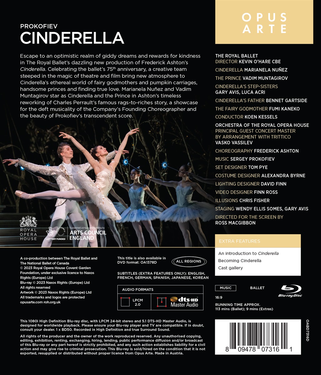 Marianela Nunez und Vadim Muntagirov spielen die Hauptrollen, Aschenputtel und den Prinzen, in Frederick Ashtons zeitloser Neubearbeitung von Charles Perraults berühmter Cinderella-Deutung – vom Tellerwäscher zum Millionär – in der sich die Musikalität des Choreographen und die Schönheit von Prokofjews transzendenter Partitur kongenial ergänzen. Ein kreatives Kostüm-, Bild-, Licht- und Bühnen-Team, durchdrungen von der Magie in Theater, Film, Tanz und Oper, bringt eine neue Perspektive in Aschenputtels ätherische Welt der guten Feen, Kürbiskutschen, gutaussehenden Prinzen und der Suche nach der wahren Liebe.