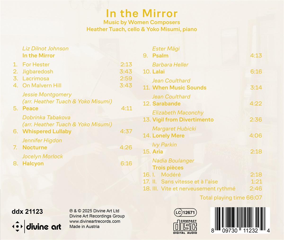 „In the Mirror“ ist eine exquisite Sammlung von Werken zeitgenössischer Komponistinnen, meisterhaft interpretiert von der Cellistin Heather Tuach und der Pianistin Yoko Misumi, beide Mitglieder des gefeierten Greenwich Trio. Das Titelstück, komponiert von Liz Dilnot Johnson, wurde speziell für dieses Projekt in Auftrag gegeben und gibt den Ton für ein Album an, das von Introspektion und Gelassenheit geprägt ist. Das Repertoire umfasst Originalwerke und neue Arrangements von renommierten Komponistinnen. Das Projekt begann während der COVID-19-Pandemie und während der Aufnahmen unterzog sich die Pianistin Yoko Misumi zudem einer erfolgreichen Krebsbehandlung. Als sie nach ihrer Genesung wieder zum Klavier zurückkehrte, fand sie in diesen Kompositionen Trost und Erneuerung und beschrieb die Erfahrung als ‚eine emotionale und musikalische Heilung‘. Zu den Höhepunkten gehören Liz Dilnot Johnsons „In the Mirror“, ein ergreifendes viersätziges Werk, das dem persönlichen Verlust und der Erneuerung gewidmet ist, Jessie Montgomerys „Peace“, das während der Pandemie komponiert und mit Zustimmung der Komponistin für Cello und Klavier bearbeitet wurde, Dobrinka Tabakovas „Whispered Lullaby“, ein bewegendes Stück, das von Goethes „Faust“ inspiriert wurde, und Margaret Hubickis lyrisches „Lonely Mere“, eine Hommage an die ruhigen Landschaften der Malvern Hills.