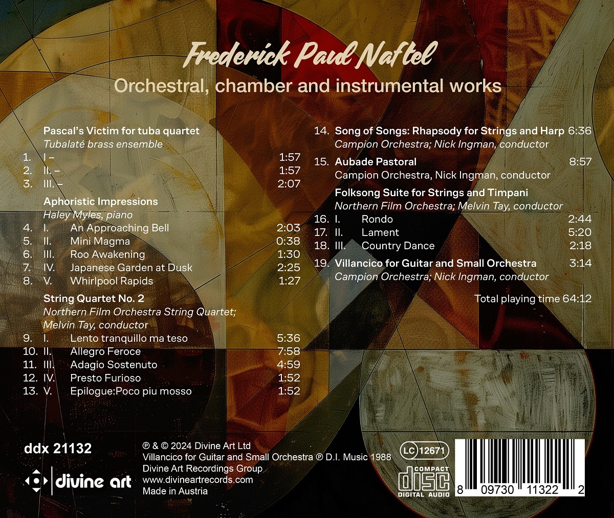 Das neue Album von Frederick Paul Naftel zeigt seinen vielseitigen Kompositionsstil anhand einer abwechslungsreichen Sammlung von Werken. Es enthält drei Erstaufnahmen: „Aphoristic Impressions“, komponiert 2023 für die amerikanische Pianistin Haley Myles, fängt die Essenz verschiedener Landschaften in fünf kurzen Klavierstücken ein. Naftels Streichquartett Nr. 2, das während der ersten Coronavirus-Pandemie komponiert wurde, spiegelt die turbulente Natur dieser Zeit wider. Die „Folksong Suite for String Orchestra and Timpani“ basiert auf sechs englischen und schottischen Volksliedern: „John Peel“, “Early One Morning“, „Ca' the Yowes“, „Loch Lomond“, „Dashing Away With The Smoothing Iron“ und „Lincolnshire Poacher“. „Pascal's Victim for Tuba Quartet“, komponiert für das im Nordwesten Englands ansässige Tubalaté, besteht aus drei Sätzen, die auf dem gregorianischen Choral „Victamae Paschali“ basieren. „Song of Songs: Rhapsody for String Orchestra and Harp“ ist eine Rhapsodie mit ethnischem Flair, die auf hebräischen Gesängen und Originalmaterial basiert und Melodien wie „Yigdal“ und „Hatikvah“ enthält. „Villancico for Guitar and Small Orchestra“ schlägt eine Brücke zwischen der Musik der spanischen Renaissance und Joaquin Rodrigo in einer charmanten und lyrischen Rondo-Form, während „Aubade Pastorale for String Orchestra“ eine kurze Tondichtung ist, die einen dunstigen Tag in der englischen Landschaft darstellt und dabei Original-Themen verwendet, die von der englischen Pastoralschule, insbesondere von Ralph Vaughan Williams, inspiriert sind. Frederick Paul Naftel, 1956 in Manchester geboren, ist ein vielseitiger Komponist, der sich von verschiedenen Quellen wie Landschaften, Natur und historischen Ereignissen inspirieren lässt. Sein Repertoire umfasst Orchesterkonzerte, Sinfonien, Kammermusik und Vokalwerke.