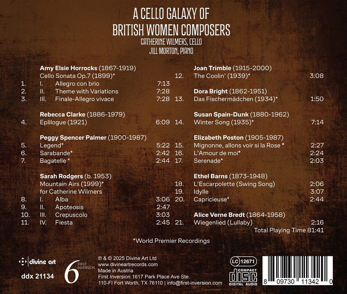 In „A Cello Galaxy of British Women Composers“ präsentiert Catherine Wilmers eine außergewöhnliche Sammlung von Werken britischer Komponistinnen und stellt uns zwölf Erstaufnahmen vor. Nach sorgfältiger Recherche hat Wilmers bemerkenswert originelle Kompositionen aufgespürt und präsentiert uns Erstaufnahmen von Amy Elsie Horrocks, Ethel Barns, Elizabeth Poston, Joan Trimble, Dora Bright, Susan Spain Dunk und Sarah Rodgers, deren „Mountain Airs“ für die Cellistin geschrieben wurde. Einige dieser Werke lagen vergessen in den Archiven der Royal Academy of Music, ihr Potenzial eher durch gesellschaftliche Zwänge als durch künstlerische Qualität unterdrückt. Das Album ist mehr als eine Wiederentdeckung – es ist ein Zeugnis der Widerstandsfähigkeit und Kunstfertigkeit dieser Komponistinnen. Die ausführlichen Booklet-Texte geben Aufschluss über die Herausforderungen, denen sie sich stellen mussten. Noch in den 1920er Jahren wiederholte der Kritiker Cecil Gray die berüchtigte Bemerkung von Dr. Johnson: ‚Eine Frau komponiert wie ein Hund, der auf seinen Hinterbeinen läuft; es ist nicht gut, aber man ist überrascht, dass es überhaupt möglich ist.‘ Solche Abwertungen machen es umso notwendiger, sich heute für diese Stimmen einzusetzen. Wilmers' tiefe Verbundenheit mit diesem Repertoire zeigt sich in jeder Darbietung, die von der begleitenden Pianistin Jill Morton einfühlsam untermalt wird. Als ehemalige Cellistin des London Philharmonic Orchestra hat Catherine Wilmers lange hinterfragt, warum so wenige Werke von Frauen in das Standardrepertoire aufgenommen wurden. Dieses Album ist Teil ihrer Antwort – eine strahlende und längst überfällige Würdigung ihrer Musik.