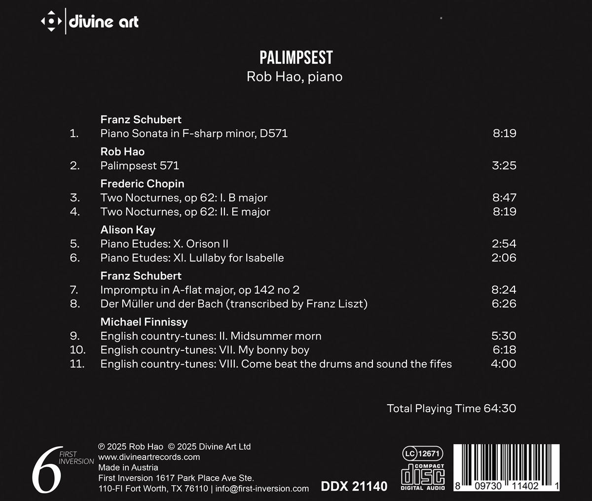 Der australische Pianist Rob Hao gibt sein beeindruckendes Debüt mit einem Album, das erforscht, wie Musik aus verschiedenen Epochen und Stilrichtungen miteinander interagieren und neue Ideen inspirieren kann. Im Mittelpunkt der Aufnahme steht die Uraufführung von „Palimpsest 571“, Haos Originalwerk, das Franz Schuberts unvollendete „Klaviersonate in fis-Moll“, D. 571, vervollständigt. Anstatt Schuberts Stil exakt zu imitieren, nimmt Hao die Kluft zwischen Vergangenheit und Gegenwart an und schafft eine Fortsetzung, die die Stimmung und das Geheimnisvolle des Originalfragments respektiert und gleichzeitig eine frische, moderne Stimme hinzufügt. Das Album enthält außerdem eine Reihe von Klavieretüden der britischen Komponistin Alison Kay, deren minimalistische und atmosphärische Stücke den Zuhörer einladen, Klang und Stille auf neue Weise zu erleben. Neben diesen zeitgenössischen Werken finden sich sorgfältig ausgewählte Stücke von Frédéric Chopin, Franz Schubert, Schubert in einer Transkription von Franz Liszt und Michael Finnissys anspruchsvolle „English Country Tunes“. Chopins letzte Nocturnes zeigen sein Talent, lange, fließende Melodien mit zarten Harmonien zu verbinden, und offenbaren die emotionale Tiefe, die er in seinen späten Jahren erreichte. Schuberts „Impromptu“ und Liszts Klaviertranskription von „Der Müller und der Bach“ übertragen die vokale Erzählkunst auf das Klavier. Finnissys „English Country-Tunes“ ist ein intensives Stück, das mit virtuoser Energie englische Volkstraditionen aufnimmt und zwischen Momenten der Lyrik und dramatischer Intensität wechselt. Dieses Album bietet ein reichhaltiges Hörerlebnis, das zum Nachdenken darüber anregt, wie sich Musik entwickelt – geprägt sowohl von der Geschichte als auch von der kreativen Gegenwart.