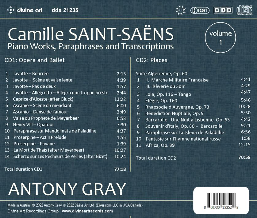 Camille Saint-Saëns‘ selten gespielte Original-Klavierstücke sind leichte Salonmusik im besten Sinne, das Gros seines Klavierwerks besteht allerdings aus Transkriptionen eigener und fremder Werke. Auf zwei Doppelalben hat der australische Pianist Antony Gray Saint-Saëns‘ Klavierraritäten aufgenommen: Volume 1 ist in zwei Abschnitte unterteilt: Transkriptionen aus Oper und Ballett sowie von bestimmten Orten inspirierte Stücke; Volume 2 besteht ebenso aus zwei Teilen: Transkriptionen von Kantaten und Oratorien und originelle Gelegenheitsstücke sowie Transkriptionen zweier Werke von Luis de Milan und die „Douze Transcriptions“ (von denen es 13 gibt!) mit Werken von J. S. Bach.