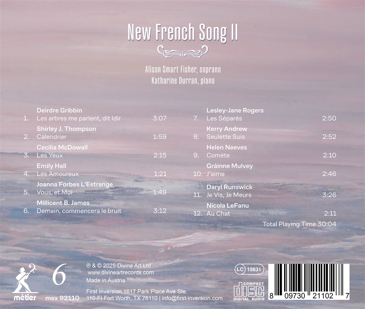 Zwei Jahrzehnte nach ihrem bahnbrechenden Album New French Song aus dem Jahr 2004 kehren die Sopranistin Alison Smart Fisher und die Pianistin Katharine Durran mit einer mutigen und zeitgemäßen Fortsetzung zurück. New French Song II präsentiert zehn neu in Auftrag gegebene Vertonungen französischer Texte von Frauen und nicht-binären Komponistinnen, die das Kunstlied-Repertoire um neue Perspektiven und leuchtende Kreativität erweitern.