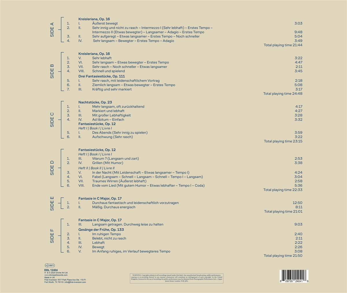 Die Deluxe-Pressung von „Fantasies“, Burkard Schliessmanns wunderbarer Interpretation der Solo-Klavierwerke von Robert Schumann erscheint nun als audiophile Ausgabe mit drei goldfarbenen LPs und folgt auf die gefeierte Veröffentlichung des Albums auf SACD und Dolby Atmos Digital, die sowohl für ihre Klangtreue als auch für ihre interpretatorische Tiefe viel Lob erhielt. Das Album wurde in den renommierten Teldex Studios in Berlin mit Produzent Julian Schwenkner und Toningenieur Jupp Wegner aufgenommen. Mit einem Setup aus 14 Mikrofonen wurde die ganze Bandbreite von Schliessmanns Kunstfertigkeit eingefangen und die komplexe emotionale Architektur und Ausdruckskraft von Schumanns Kompositionen offenbart. Schliessmann bringt die strukturelle Raffinesse der Musik zur Geltung und stellt dabei kühne Verbindungen zu Richard Wagners „Tristan“ her, während er gleichzeitig einen weitläufigen, poetischen Lyrismus an den Tag legt. Das Ergebnis ist eine aufschlussreiche Reise durch Schumanns Psyche – eine Reise, die das Schumann Journal als ‚völlig neu, überraschend und unerwartet ... ein MUSS!‘ (Irmgard Knechtges-Obrecht) beschrieb, während der American Record Guide den ‚perfekten‘ Klang des Albums als ‚eine der schönsten Aufnahmen, die ich in letzter Zeit gehört habe‘ (Rob Haskins) lobte. Diese auf schwerem Goldvinyl gepresste Ausgabe bietet analoge Wärme und Detailtreue, die selbst den anspruchsvollsten Hörer begeistern werden. „Fantasies“ ist ein unverzichtbares Sammlerstück und setzt Burkard Schliessmanns Tradition kompromissloser Interpretationen und herausragender Tonqualität fort.