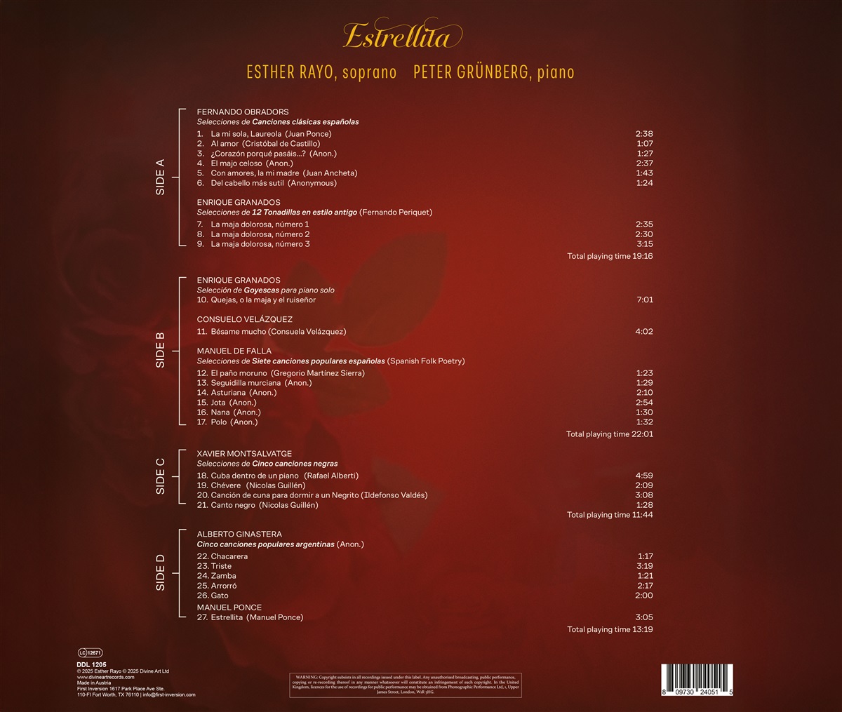 Die lyrische Sopranistin Esther Rayo und der renommierte Pianist und Dirigent Peter Grünberg präsentieren eine Sammlung sinnlicher klassischer spanischer Lieder für Gesang und Klavier. Dieses Programm wurde erstmals in einer Konzertreihe der in San Francisco ansässigen Lehr- und Aufführungsorganisation LIEDER ALIVE! aufgeführt. Das Album enthält Lieder von spanischsprachigen Komponisten des frühen 20. Jahrhunderts: Fernando Obradors, Manuel de Falla, Enrique Granados, Alberto Ginastera, Xavier Montsalvatge, Consuelo Velázquez und Manuel Ponce. Diese lebendigen Liederzyklen, die sich an der klassischen spanischen Poesie und regionalen Volksmelodien orientieren, sprechen sowohl Liebhaber des Kunstliedes als auch Ersthörer an. Der in Kalifornien geborene Esther Rayo, die von spanischer Musik und Sprache umgeben aufwuchs, liegt diese Musik besonders am Herzen. Ihre professionelle Verbindung zu diesen Liedern begann, als sie während ihres Studiums mit der Musik von Manuel Obradors in Berührung kam. Obradors bot ihr den perfekten Ausgangspunkt für ihr weiteres Forschen und so entdeckte sie das spanische Kunstlied für sich. Großen Sopranistinnen des 20. Jahrhunderts, wie Montserrat Caballé und Victoria de los Angeles, die diese Musik am Leben erhielten, inspirierten sie. Während ihres Studiums im Jahr 2017 lernte Rayo Peter Grünberg kennen, und sie fanden sofort eine musikalische Verbindung über die Werke spanischsprachiger Komponisten. LIEDER ALIVE! half Rayo und Grünberg dabei, diese Musik gemeinsam aufzuführen, neben seiner eigentlichen Mission, deutsche Lieder zu fördern. Im Laufe der Jahre erarbeiteten sie immer mehr klassisches spanisches Repertoire, und so kam es schließlich zu diesem gemeinsamen Debütalbum. Und selbst nach all dieser Zeit haben sie immer noch das Gefühl, nur einen Bruchteil dieses wunderbaren Repertoires entdeckt zu haben!