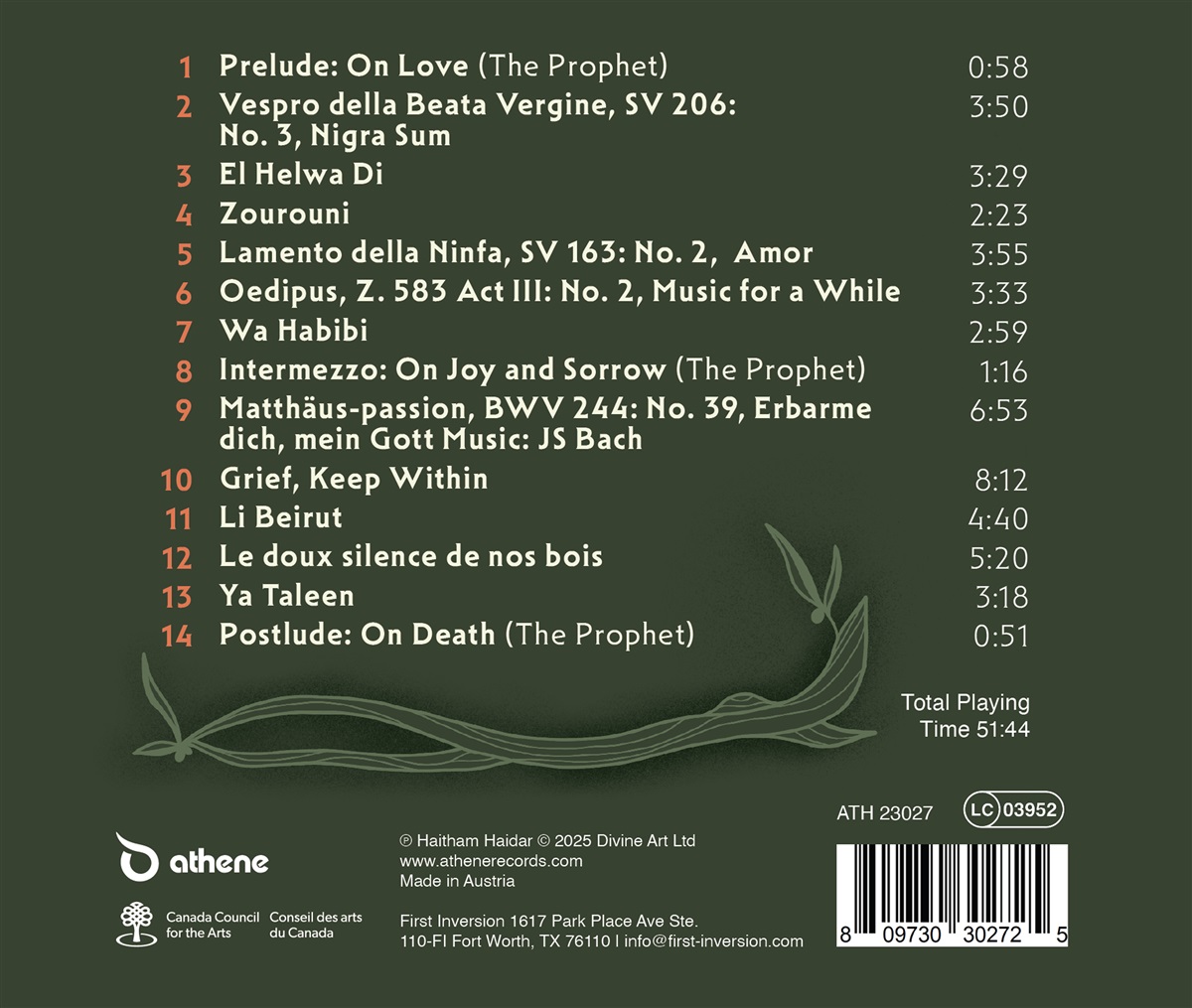 Das Debüt-Soloalbum „Zaytoun“ (arabisch für „Olive“) des Tenors Haitham Haidar ist eine fesselnde Sammlung wunderschöner barocker und arabischer Lieder, verwoben mit Poesie und musikalischen Improvisationen, eine Erkundung der Schnittmenge zwischen barocker und arabischer Musik. Ob durch Instrumentierung, Ornamentik oder Gesang, „Zaytoun“ hebt die natürlichen Verbindungen zwischen Welten hervor, die wir normalerweise als getrennt betrachten. Haidar verbindet barocke Arien und Lieder von Claudio Monteverdi, Henry Purcell und Johann Sebastian Bach mit traditionellen arabischen Liedern, die seine erste Begegnung mit der Musik waren. Er hat einige dieser barocken Standards mit arabischer Instrumentierung versehen und sogar eine Bach-Arie ins Arabische übersetzt, um den arabischen Stil in die barocke Struktur einzubringen. Neben der Musik gibt es drei Gedichttracks (aus Gibrans Khalil Gibrans „Der Prophet“), die von Abdul-Wahab Kayyali mit wunderschöner Oud-Improvisation vorgetragen werden. Diese Stücke („Präludium“, „Intermezzo“ und „Postludium“) tragen dazu bei, Haidars Erzählung seiner eigenen Einwanderungsgeschichte in der einzigartigen Verflechtung von arabischer und barocker Musik zu gestalten. Haitham Haidar ist ein libanesisch-palästinensischer kanadischer Tenor, der für seine Musikalität, seine „herausragende Präsenz“ und seine einfühlsamen Erzählungen sehr geschätzt wird. Er ist stolzer Absolvent des Yale's Institute of Sacred Music, der McGill's Schulich School of Music und der University of British Columbia und lebt derzeit in Montreal, Quebec. Haitham wird für seine „musikalische und sprachliche Vielseitigkeit“ und seine ‚helle‘ und ‚von Natur aus lyrische Stimme‘ gelobt und tritt gerne in Nordamerika, Europa und Asien mit Oratorien, Opern und Kammermusik auf. Seine Aufnahmen als Solist mit den Ensembles Conspirare und Skylark wurden mehrfach für den Grammy nominiert.