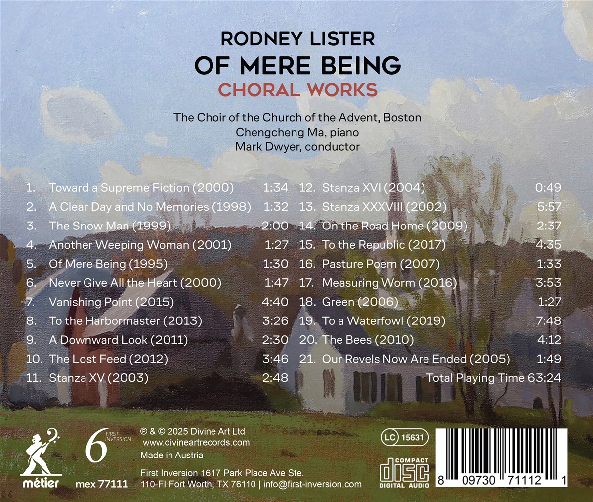 Rodney Listers Chorwerke sind eine bemerkenswerte Synthese aus literarischer Sensibilität, harmonischer Raffinesse und einem unerschütterlichen Bekenntnis zur vokalen Ausdruckskraft. Diese Aufnahme umfasst eine Sammlung von Listers Werken – Weltersteinspielungen – die er über mehrere Jahrzehnte für den Chor des Greenwood Music Camp komponierte, einem Sommerprogramm, in dem er als Komponist, Pianist und Mentor eng eingebunden war. Das hier vorgestellte Repertoire bietet einen Einblick in die Entwicklung seines Chorwerks, das von frühen diatonischen und modalen Experimenten bis zu späteren Werken von größerer harmonischer Komplexität reicht. Listers intensive Auseinandersetzung mit dem Text ist in dieser Sammlung durchweg spürbar. Unter Rückgriff auf Dichter wie Wallace Stevens, Gertrude Stein und andere bringt er den Rhythmus, die Klangfarben und Nuancen der Sprache auf eine Weise zur Geltung, die sowohl natürlich als auch aufschlussreich wirkt. Frühe Werke zeichnen sich durch Klarheit und Direktheit aus, wobei die Form und Syntax der Gedichte die musikalischen Entscheidungen leiten, während spätere Stücke eine dichtere harmonische Sprache aufweisen, die seine Affinität zu Figuren wie Virgil Thomson und sogar die chromatische Kühnheit von Komponisten wie Gesualdo widerspiegelt. Es singt der Choir of the Church of the Advent aus Boston, begleitet von ChengCheng Ma am Klavier, unter der Leitung von Mark Dwyer.