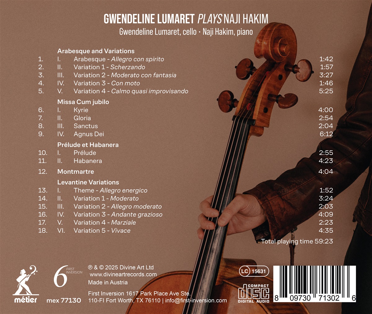 Dieses Album präsentiert eine beeindruckende Sammlung von Solo- und Kammerwerken für Cello von Naji Hakim, gespielt von Gwendeline Lumaret mit Klarheit, Virtuosität und tiefem Ausdruck. Mit den Welturaufführungen dieser Werke leistet dieses Album einen bedeutenden Beitrag zum zeitgenössischen Cello-Repertoire. Hakim, der für seine Synthese aus westlicher Klassik und nahöstlichen Einflüssen bekannt ist, schreibt komplexe und zugleich unmittelbare Musik, die sich aus so unterschiedlichen Quellen wie gregorianischen Gesängen, levantinischer Volksmusik und den harmonischen Innovationen der französischen Moderne speist. Das Album begeistert mit ganz unterschiedlichen Werken, beispielsweise der „Arabesque et Variations“, das von dem ägyptischen Lied „Ya Chadi el Alhhan“ von Sayyed Darwish inspiriert ist. Das Stück durchläuft vier kontrastreiche Variationen, die von verspielter Tanzmusik zu kontemplativer Lyrik übergehen, bevor es mit einer intimen, improvisatorischen Coda endet. „Missa Cum Jubilo“ greift Themen aus der Gregorianischen Messe IX auf. Jeder Satz verwandelt das Gesangsmaterial in unterschiedliche Klangwelten, von der ausdrucksstarken Ornamentik des „Kyrie“ über die permanente Bewegung des „Sanctus“ bis hin zur leuchtenden Ruhe des „Agnus Dei“.„Montmartre“ ist eine zutiefst persönliche Reflexion über die Geschichte und spirituelle Resonanz des Pariser Stadtteils, in dem Hakim als Organist der Basilique du Sacré-Coeur tätig war. Gwendeline Lumaret, eine bemerkenswert vielseitige Interpretin, bringt den rhythmischen und expressiven Reichtum von Hakims Kompositionen zur Geltung und beleuchtet mit Präzision und Kunstfertigkeit das Zusammenspiel östlicher und westlicher Traditionen in der Musik.