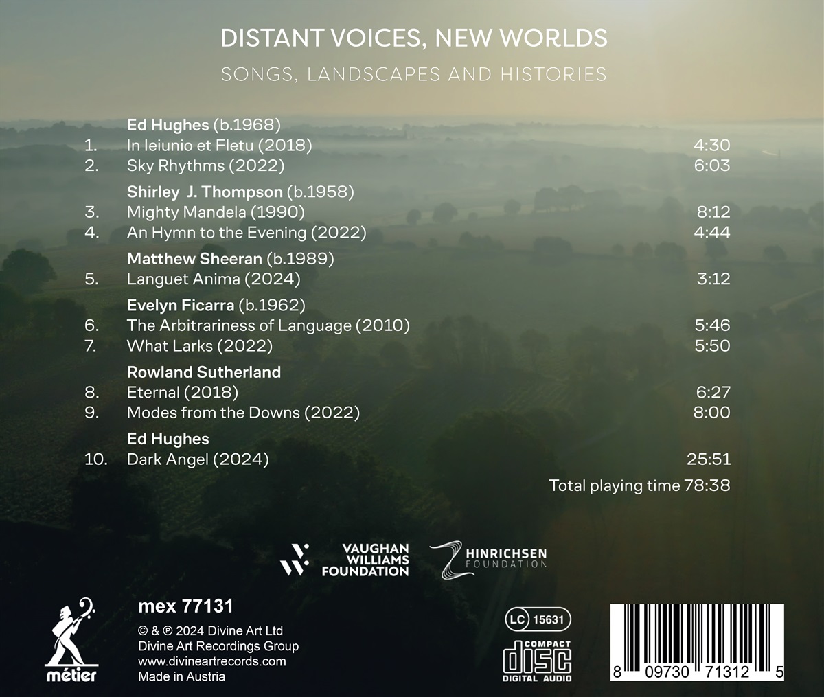 Dieses spannende Album enthält Weltpremieren von neun Kammer- und Solowerken, die die unverwechselbaren und vielfältigen Stimmen von fünf gefeierten britischen Komponisten präsentieren. Im Mittelpunkt stehen vier speziell in Auftrag gegebene Lieder aus dem Jahr 2022 für Sopran und Ensemble, die das South Downs Songbook bilden. Dieses Projekt reflektiert über die menschliche Erfahrung der South Downs, der Kreidehügel, die sich von Winchester bis Eastbourne erstrecken, und feiert sie zugleich. Die beauftragten Komponisten – Shirley J Thompson, Rowland Sutherland, Evelyn Ficarra und Ed Hughes – bringen jeweils eine einzigartige Perspektive in das Projekt ein. Ihre Werke sind von Spaziergängen durch die South Downs inspiriert und vertonen Texte, die unterschiedliche Ansichten über Landschaft und Geschichte bieten. Ergänzt werden diese Werke durch fünf weitere Kompositionen, die von den New Music Players aufgenommen wurden und ein Kaleidoskop neuer britischer Musik und historischer Stimmen schaffen.