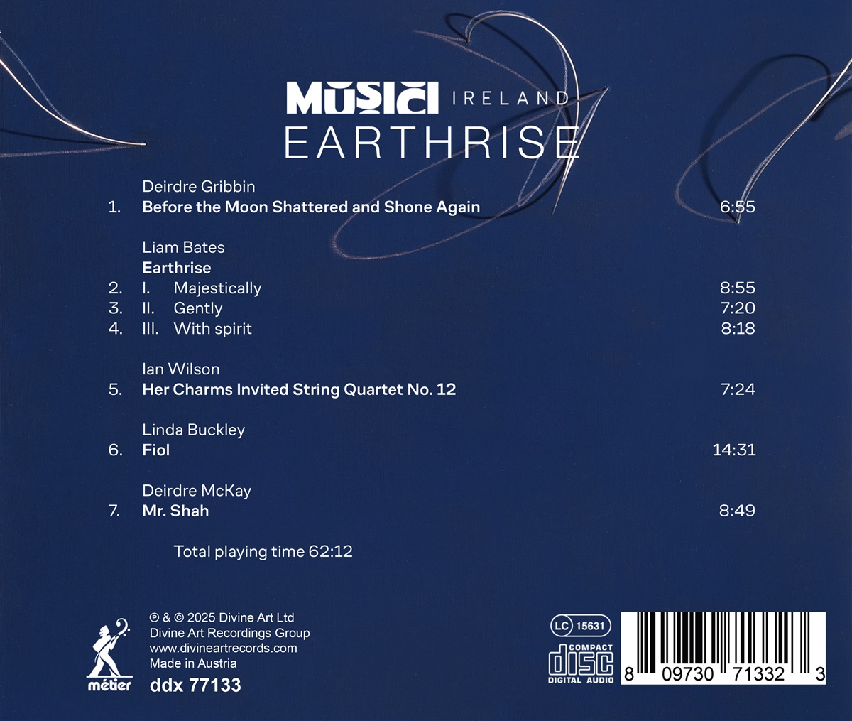 Musici Ireland, unter der Leitung der Bratschistin Beth McNinch, hat sich seit seiner Gründung im Jahr 2012 als Pionier der irischen Kammermusik etabliert. Das Ensemble ist dafür bekannt, zeitgenössische Werke in Auftrag zu geben und uraufzuführen. Es zeichnet sich durch sein Engagement für irische und weibliche Komponisten aus und erweitert die Grenzen der modernen Kammermusik mit einem interdisziplinären und sozial engagierten Ansatz. Deirdre Gribbins „Before the Moon Shattered and Shone Again“ erforscht die Zyklen der Natur, inspiriert von der keltischen Mythologie und der ständigen Präsenz des Mondes. Das Streichquartett symbolisiert das Wachsen, Schwinden und die Erneuerung des Lebens – eine passende Antwort auf die Stille und die Störungen, die durch die Pandemie verursacht wurden. Deirdre McKays „Mr Shah“ lässt sich von der Stille des Weltraums inspirieren und betrachtet den starken Kontrast zwischen der fast vollständigen Stille des Kosmos und dem Klangreichtum auf der Erde. Ian Wilsons „Her Charms Invited“ (Streichquartett Nr. 12) interpretiert die komplexe Ornamentik des traditionellen irischen Sean-Nós-Gesangs in einem zeitgenössischen musikalischen Rahmen neu. Linda Buckleys „Fiol“ (für Streichtrio) behandelt das Ensemble als zwölfsaitiges „Meta-Instrument“ und erinnert an die Resonanzen der norwegischen Hardanger-Fiedel. Das Titelstück, Liam Bates' „Earthrise“, das von Musici Ireland in Auftrag gegeben wurde, zieht seine Inspiration aus der Bewegung unseres Planeten. Mit Beth McNinch an der Bratsche fängt das Stück den seelenvollen Klang der Bratsche ein und erinnert an einen umherwandernden Beobachter, der an den sich entwickelnden Rhythmen und Harmonien der Erde teilnimmt.