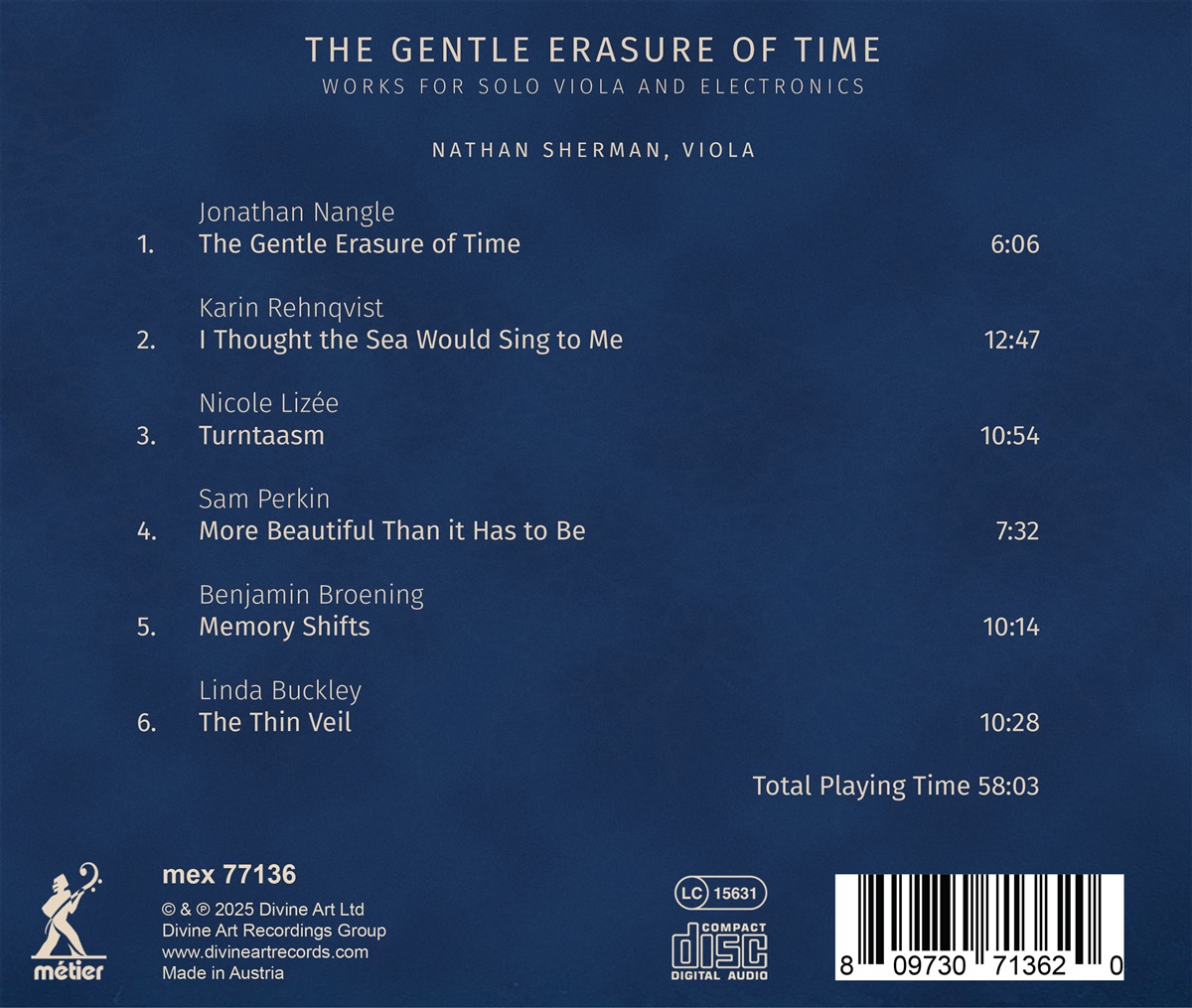 „The Gentle Erasure of Time“, das fesselnde und faszinierende Solo-Debütalbum des in Dublin lebenden US-amerikanischen Bratschisten Nathan Sherman, ist eine Sammlung neuer Auftragswerke für Solo-Bratsche und Elektronik. Sherman erschafft eine eindringliche Klanglandschaft, die zwischen eindringlichen, hypnotisierenden Passagen und intensiven, filmischen Momenten wechselt. Mit Werken der renommierten Komponisten Nicole Lizée, Karin Rehnqvist, Jonathan Nangle, Linda Buckley, Benjamin Broening und Sam Perkin erkundet das Album Themen wie Erinnerung, Bewegung und Schönheit und schafft eine lebendige Verbindung zwischen akustischen und elektronischen Bereichen.