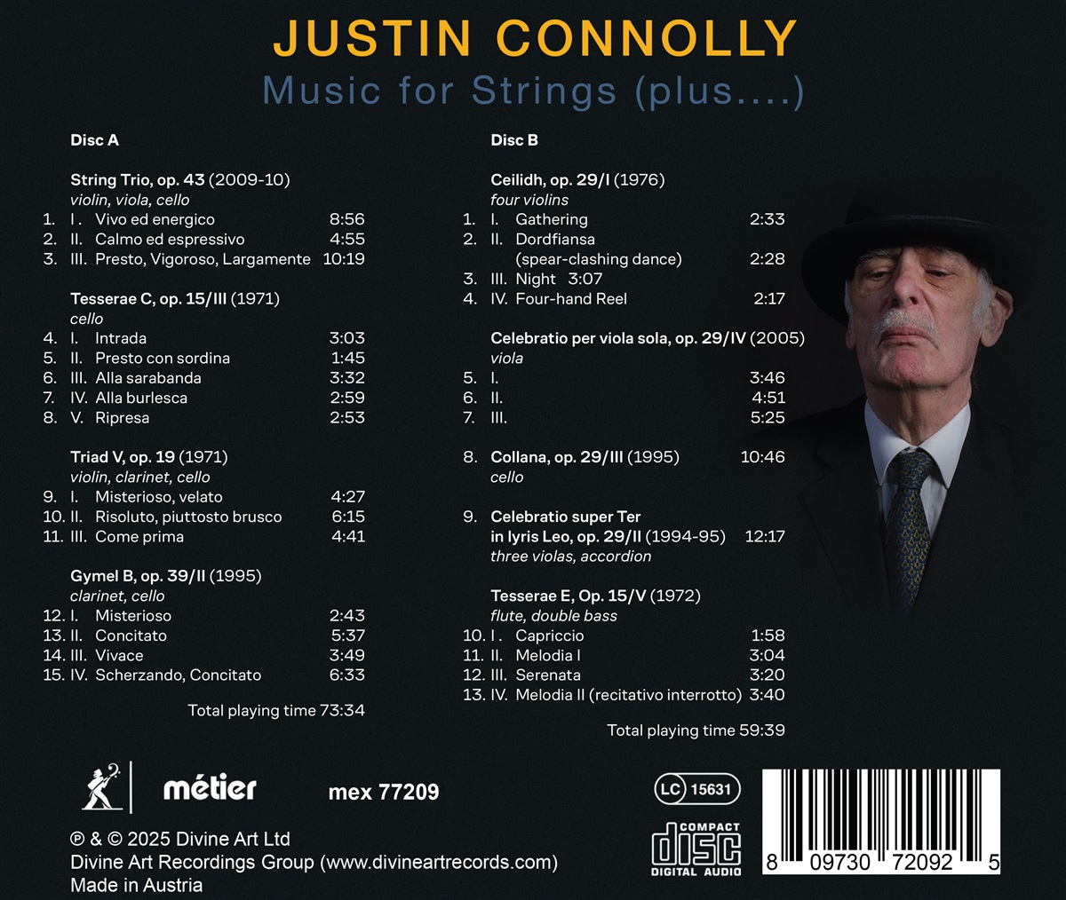 Dieses Doppelalbum enthält unter anderem vier Weltpremieren-Aufnahmen von Justin Connollys kunstvoll gestalteten Werken und rückt damit einen Komponisten ins Rampenlicht, der einst von Pierre Boulez zu den fesselndsten britischen Stimmen seiner Zeit gezählt wurde. Connollys Musik, die sich durch konzeptionelle Strenge, lyrische Intensität und spielerische Erfindungsgabe auszeichnet, war in den letzten Jahrzehnten auf der öffentlichen Bühne weitgehend abwesend. Eine lange kompositorische Pause im späten 20. Jahrhundert mag zu dieser Nichtbeachtung beigetragen haben, aber seine einzigartige Stimme wird nun durch diese umfassende Aufnahme wiederentdeckt. Cellist und Produzent Neil Heyde leitet das Projekt zusammen mit den Kollegen des Kreutzer Quartetts, Peter Sheppard Skærved und Mihailo Trandafilovski, wobei der Klarinettist Roger Heaton auf „Gymel-B“ zu hören ist. Das Album enthält auch Kooperationen mit Studenten der Royal Academy of Music, die einen lebendigen generationenübergreifenden Austausch in Connollys größeren Ensemblewerken ermöglichen. Aufgenommen im Frühjahr 2024 in London von dem renommierten Toningenieur Adaq Khan und unterstützt durch ein Forschungsstipendium des Forschungsausschusses der Royal Academy of Music, fängt dieses Projekt Connollys Kunstfertigkeit mit außergewöhnlicher Klarheit ein.