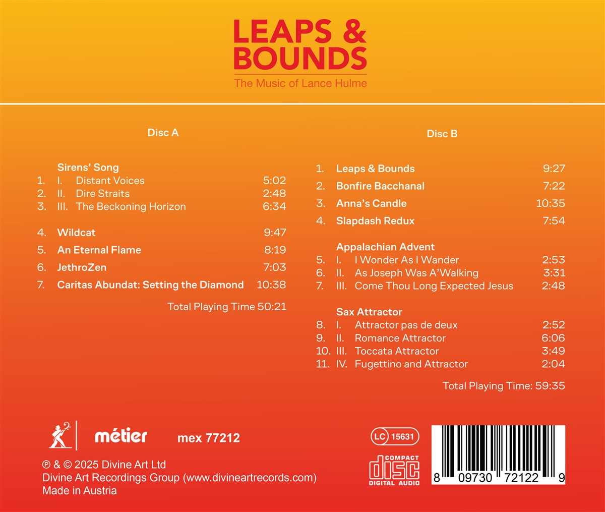 „Leaps & Bounds: The Music of Lance Hulme“ präsentiert eine fesselnde Übersicht über das Werk von Dr. Lance Hulme und zeigt seine intellektuelle Strenge, seine erfinderischen Kompositionstechniken und seine Auseinandersetzung mit verschiedenen kulturellen und historischen Kontexten. Einige Beispiele: „Sirens' Song“, ein symphonisches Triptychon, das von Homers Odyssee inspiriert ist, verbindet Orchestertechniken des 19. und frühen 20. Jahrhunderts mit moderner thematischer Erkundung. „Wildcat“, ursprünglich vom Raschér Saxophone Quartet in Auftrag gegeben, spiegelt eine lebendige klangliche Darstellung von kinetischer Energie und Freude wider und greift dabei auf persönliche und kulturelle Erzählungen zurück. „JethroZen“ stellt die vom Rock inspirierte Flötenmusik von Ian Anderson (Jethro Tull) den meditativen Klangfarben der japanischen Shakuhachi gegenüber und schlägt so eine Brücke zwischen östlichen und westlichen Musiktraditionen. „Setting the Diamond“ bietet eine innovative Auseinandersetzung mit mittelalterlichem Gesang, indem es Hildegard von Bingens Hymnodik mit elektronischem und akustischem Kontrapunkt verbindet. „An Eternal Flame“, das den Menschen in der Ukraine gewidmet ist, zeigt seine Fähigkeit, tiefgründige menschliche Erzählungen in komplexe kompositorische Strukturen einzubetten. Dieses Album lädt Wissenschaftler, Interpreten und Zuhörer ein, die Schnittstellen von Tradition, Innovation und kulturellem Dialog in Hulmes Werk zu erkunden.