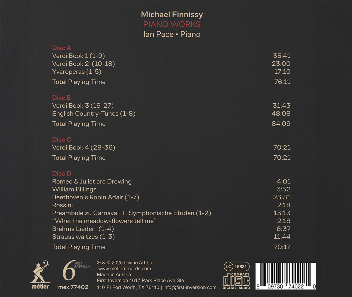 Dieses 4-CD-Boxset des Pianisten Ian Pace präsentiert Musik des Komponisten Michael Finnissy (* 1946). Finnissy gilt weithin als einer der bedeutendsten lebenden Komponisten Großbritanniens. Pace, einer der führenden Interpreten von Finnissys Werken, präsentiert ein Album, das sich um Finnissys epischen Zyklus für Klavier, die „Verdi Transcriptions“, dreht, zusammen mit der zweiten vollständigen Aufnahme (nach der des Komponisten selbst) der ikonischen „English Country-Tunes“ und Werken, die von der Musik des späten 18. und 19. Jahrhunderts inspiriert sind. Das Ergebnis ist ein umfassender Überblick über Finnissys umfangreiches Klavierwerk im Zusammenhang mit der romantischen Ästhetik. Das Album erscheint im Vorfeld der Feierlichkeiten zum 80. Geburtstag von Michael Finnissy im Jahr 2026. Finnissys Zyklus „Verdi Transcriptions“ interpretiert Verdis Opern aus einer modernen Perspektive neu – das Ergebnis ist ein monumentales, spätromantisches Epos. Finnissys „English Country-Tunes“ gilt seit langem als eines seiner charakteristischsten und technisch anspruchsvollsten Werke. Ian Pace spiegelt in seiner Interpretation jahrzehntelange Studien wider: Er spielte „English Country-Tunes“ erstmals in den 1990er Jahren und hat Finnissys gesamtes Klavierwerk in Zyklen aufgeführt (1996 und 2016). Das Set enthält ausführliche Begleittexte von Pace und Finnissy, die seltene Einblicke in die kompositorischen Ideen und interpretatorischen Entscheidungen hinter diesen anspruchsvollen Werken geben.
