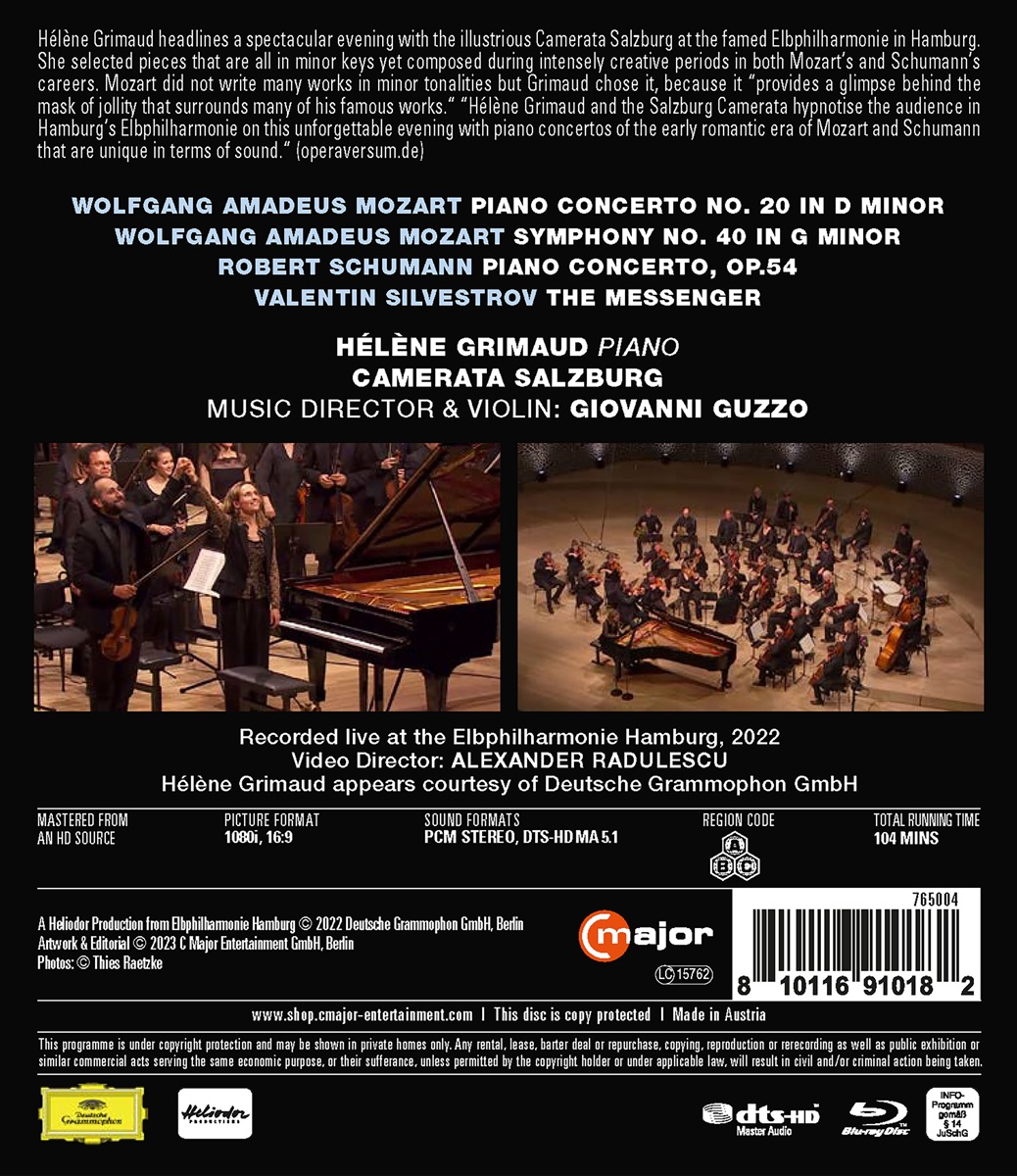 Hélène Grimaud bei einem unvergesslichen Abend in der Hamburger Elbphilharmonie mit der Camerata Salzburg unter Giovanni Guzzo: Ausgewählt wurden Stücke von Wolfgang Amadeus Mozart und Robert Schumann in Moll-Tonarten, die hervorragend zum melancholischen Werk „The Messenger“ des ukrainischen Komponisten Valentin Silvestrov passen. Grimaud schätzt die wenigen Moll-Werke Mozarts, „weil sie einen Einblick hinter die Maske der Fröhlichkeit vieler berühmter Stücke gewähren“. Konzertmeister Guzzo, seine Camerata Salzburg und Grimaud sind ein eingeschworenes Team, das oft schon gemeinsam aufgetreten ist.