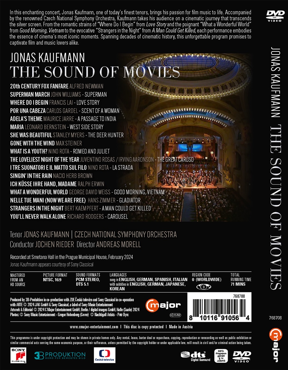 In diesem bezaubernden Konzert erweckt Jonas Kaufmann, einer der besten Tenöre der Gegenwart, seine Leidenschaft für Filmmusik zum Leben. Begleitet vom renommierten Tschechischen Nationalen Symphonieorchester nimmt Kaufmann sein Publikum mit auf eine filmische Reise, die über die Leinwand hinausgeht. Von den romantischen Klängen von „Where Do I Begin“ aus „Love Story“ und dem ergreifenden „What a Wonderful World“ aus „Good Morning, Vietnam“ bis hin zum bewegenden „Strangers in the Night“ aus „A Man Could Get Killed“ verkörpert jede Darbietung die Essenz der ikonischsten Momente des Kinos. Dieses unvergessliche Programm, das Jahrzehnte der Filmgeschichte umfasst, verspricht, Film- und Musikliebhaber gleichermaßen in seinen Bann zu ziehen. Jonas Kaufmann sagt über diese Sammlung: ‚Als leidenschaftlicher Filmfan und Sänger bin ich natürlich sehr empfänglich für alle Gesangsnummern, die in Soundtracks auf der ganzen Welt zu hören sind. Deshalb war es mir eine besondere Freude, in der Schatzkammer der Filmmusik nach den schönsten Stücken zu stöbern. Das Ergebnis ist „The Sound of Movies“, eine Sammlung wundervoller Lieder aus über achtzig Jahren Filmgeschichte. Ob sie von bewegten Bildern begleitet werden oder die Musik allein steht, sie alle haben einen Platz in meinem Herzen gefunden.‘