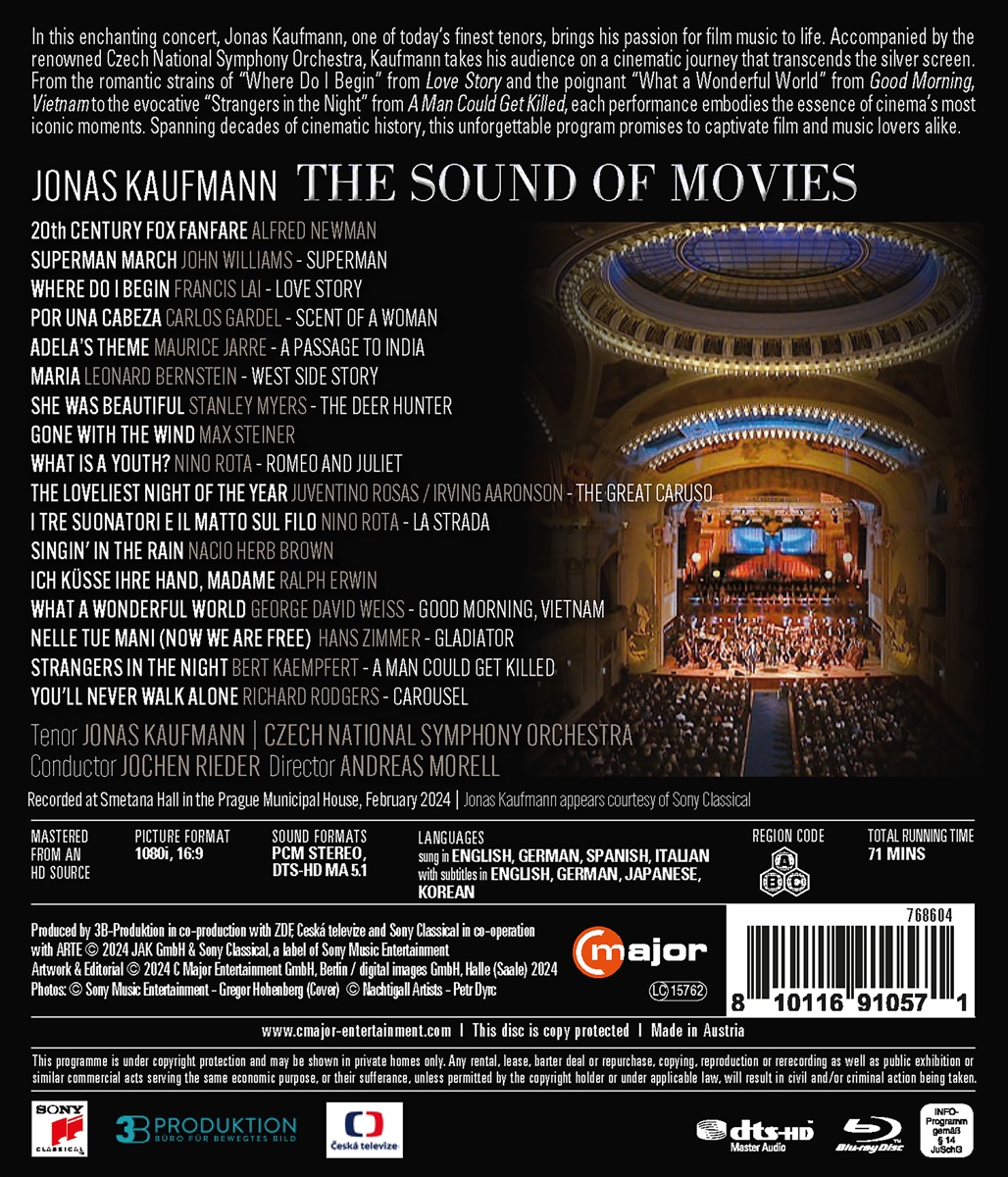 In diesem bezaubernden Konzert erweckt Jonas Kaufmann, einer der besten Tenöre der Gegenwart, seine Leidenschaft für Filmmusik zum Leben. Begleitet vom renommierten Tschechischen Nationalen Symphonieorchester nimmt Kaufmann sein Publikum mit auf eine filmische Reise, die über die Leinwand hinausgeht. Von den romantischen Klängen von „Where Do I Begin“ aus „Love Story“ und dem ergreifenden „What a Wonderful World“ aus „Good Morning, Vietnam“ bis hin zum bewegenden „Strangers in the Night“ aus „A Man Could Get Killed“ verkörpert jede Darbietung die Essenz der ikonischsten Momente des Kinos. Dieses unvergessliche Programm, das Jahrzehnte der Filmgeschichte umfasst, verspricht, Film- und Musikliebhaber gleichermaßen in seinen Bann zu ziehen. Jonas Kaufmann sagt über diese Sammlung: ‚Als leidenschaftlicher Filmfan und Sänger bin ich natürlich sehr empfänglich für alle Gesangsnummern, die in Soundtracks auf der ganzen Welt zu hören sind. Deshalb war es mir eine besondere Freude, in der Schatzkammer der Filmmusik nach den schönsten Stücken zu stöbern. Das Ergebnis ist „The Sound of Movies“, eine Sammlung wundervoller Lieder aus über achtzig Jahren Filmgeschichte. Ob sie von bewegten Bildern begleitet werden oder die Musik allein steht, sie alle haben einen Platz in meinem Herzen gefunden.‘