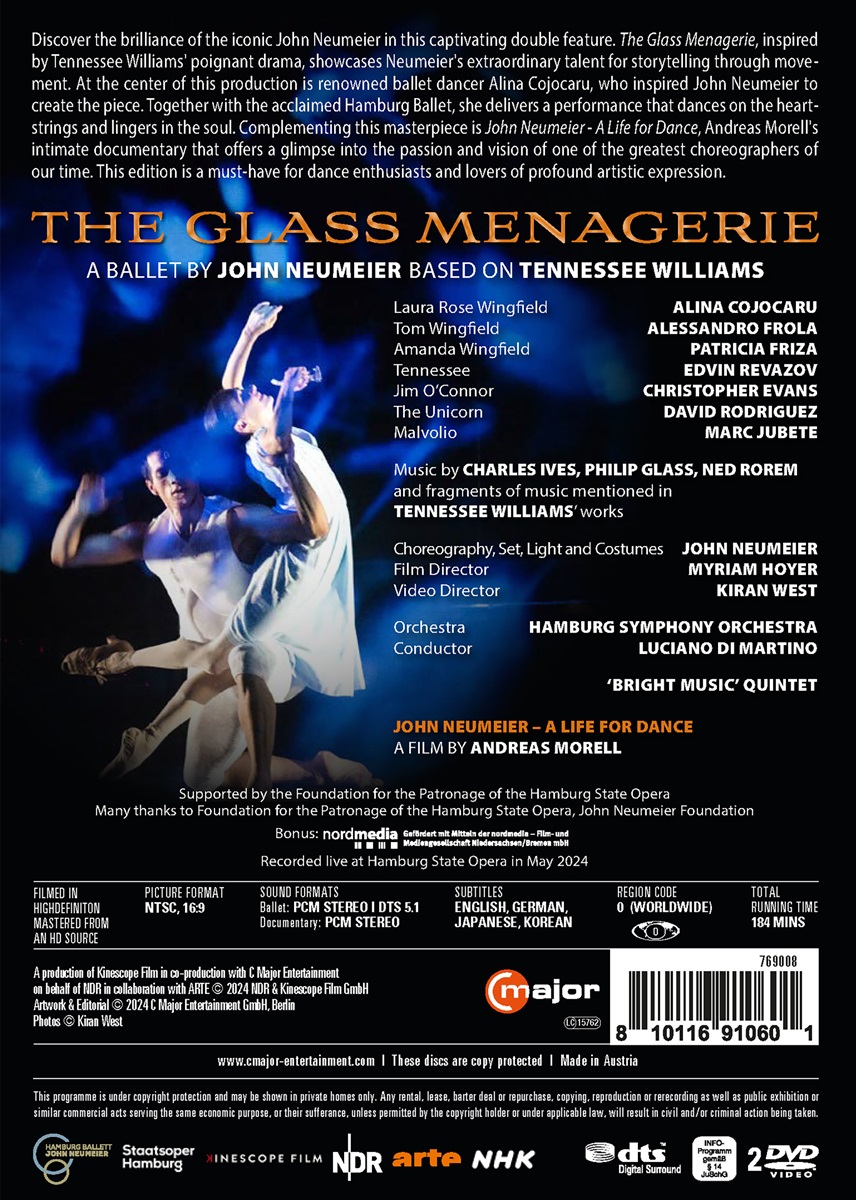 „The Glass Menagerie“, inspiriert von Tennessee Williams' ergreifendem Drama, zeigt John Neumeiers außergewöhnliches Talent, Geschichten durch Bewegung zu erzählen. Im Mittelpunkt dieser Produktion steht die renommierte Balletttänzerin Alina Cojocaru, die John Neumeier zu diesem Stück inspirierte und die meisterhaft die leicht gehbehinderte Schwester des Protagonisten darstellt. Zusammen mit dem gefeierten Hamburg Ballett liefert sie eine Performance, die ans Herz geht und in der Seele nachklingt. Neben Fragmenten einzelner Stücke, die in William’s Stück erwähnt werden, ist Musik von Charles Ives, Philip Glass und Ned Rorem zu hören. Es spielen die Hamburger Symphoniker unter der Leitung von Luciano Di Martino.