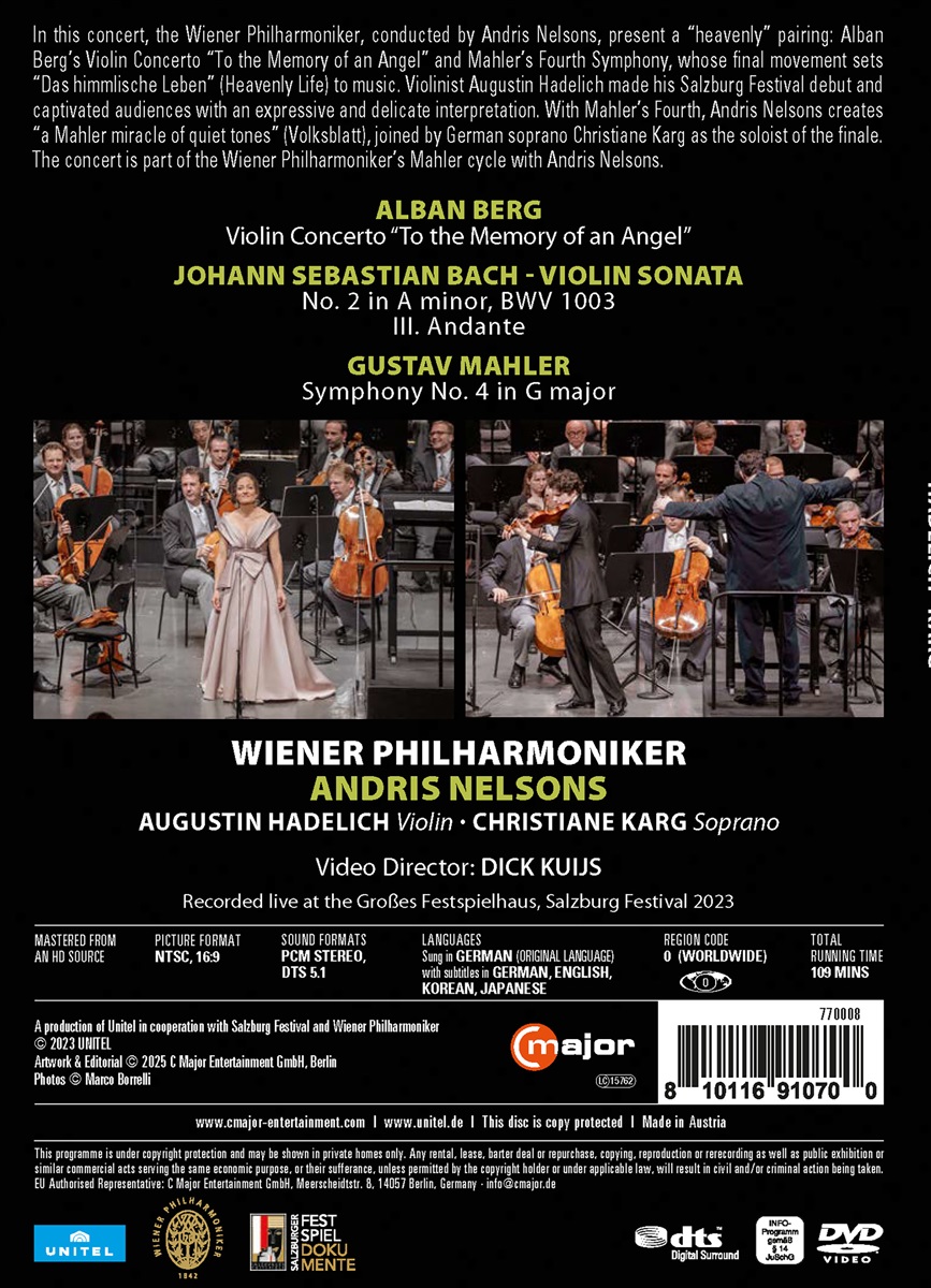 In diesem Konzert präsentieren die Wiener Philharmoniker unter der Leitung von Andris Nelsons eine „himmlische“ Paarung: Alban Bergs Violinkonzert „Dem Andenken eines Engels“ neben Mahlers vierter Symphonie, deren Schlusssatz das Lied „Das himmlische Leben“ aus „Des Knaben Wunderhorn“ vertont. Mit dieser Aufführung gab der junge deutsch-amerikanische Geiger Augustin Hadelich sein Debüt bei den Salzburger Festspielen und begeisterte die Presse: „Der fabelhafte Augustin Hadelich füllte den schwierigen Solopart mit Gefühl und Zerbrechlichkeit, sein Spiel war sensibel und doch glühend.“ (Die Presse). Mit Mahlers Vierter schafft Andris Nelsons „ein Mahler-Wunder der leisen Töne“ (Volksblatt), begleitet von der deutschen Sopranistin Christiane Karg als Solistin des Finales. Das Konzert ist Teil des Mahler-Zyklus der Wiener Philharmoniker mit Andris Nelsons.