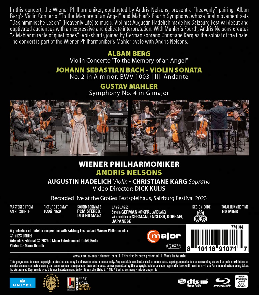 In diesem Konzert präsentieren die Wiener Philharmoniker unter der Leitung von Andris Nelsons eine „himmlische“ Paarung: Alban Bergs Violinkonzert „Dem Andenken eines Engels“ neben Mahlers vierter Symphonie, deren Schlusssatz das Lied „Das himmlische Leben“ aus „Des Knaben Wunderhorn“ vertont. Mit dieser Aufführung gab der junge deutsch-amerikanische Geiger August Hadelich sein Debüt bei den Salzburger Festspielen und begeisterte die Presse: „Der fabelhafte Augustin Hadelich füllte den schwierigen Solopart mit Gefühl und Zerbrechlichkeit, sein Spiel war sensibel und doch glühend.“ (Die Presse). Mit Mahlers Vierter schafft Andris Nelsons „ein Mahler-Wunder der leisen Töne“ (Volksblatt), begleitet von der deutschen Sopranistin Christiane Karg als Solistin des Finales. Das Konzert ist Teil des Mahler-Zyklus der Wiener Philharmoniker mit Andris Nelsons.