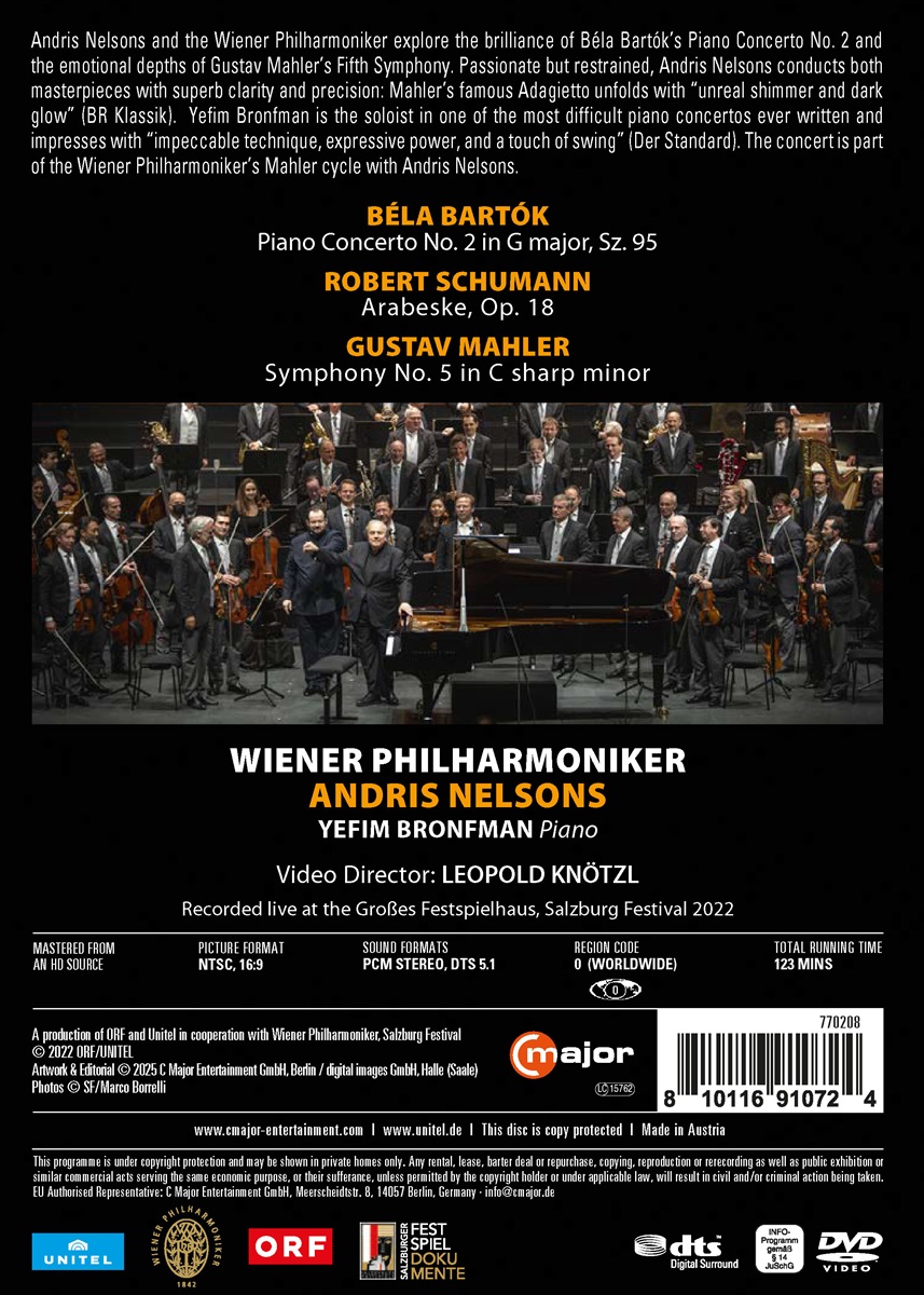 Andris Nelsons und die Wiener Philharmoniker erkunden die Brillanz von Béla Bartóks Klavierkonzert Nr. 2 und die emotionale Tiefe von Gustav Mahlers Fünfter Sinfonie. Leidenschaftlich, aber zurückhaltend dirigiert Andris Nelsons beide Meisterwerke mit hervorragender Klarheit und Präzision: Mahlers berühmtes Adagietto entfaltet sich mit ‚unwirklichem Schimmer und dunklem Glanz‘ (BR Klassik). Yefim Bronfman ist Solist in einem der schwierigsten Klavierkonzerte, die je geschrieben wurden, und beeindruckt mit ‚makelloser Technik, Ausdruckskraft und einem Hauch von Swing‘ (Der Standard). Als Zugabe spielen die Philharmoniker die Arabesque von Robert Schumann. Das Konzert ist Teil des Mahler-Zyklus der Wiener Philharmoniker mit Andris Nelsons. Die Videoaufnahmen entstanden live im Großen Festspielhaus anlässlich der Salzburger Festspiele 2022.