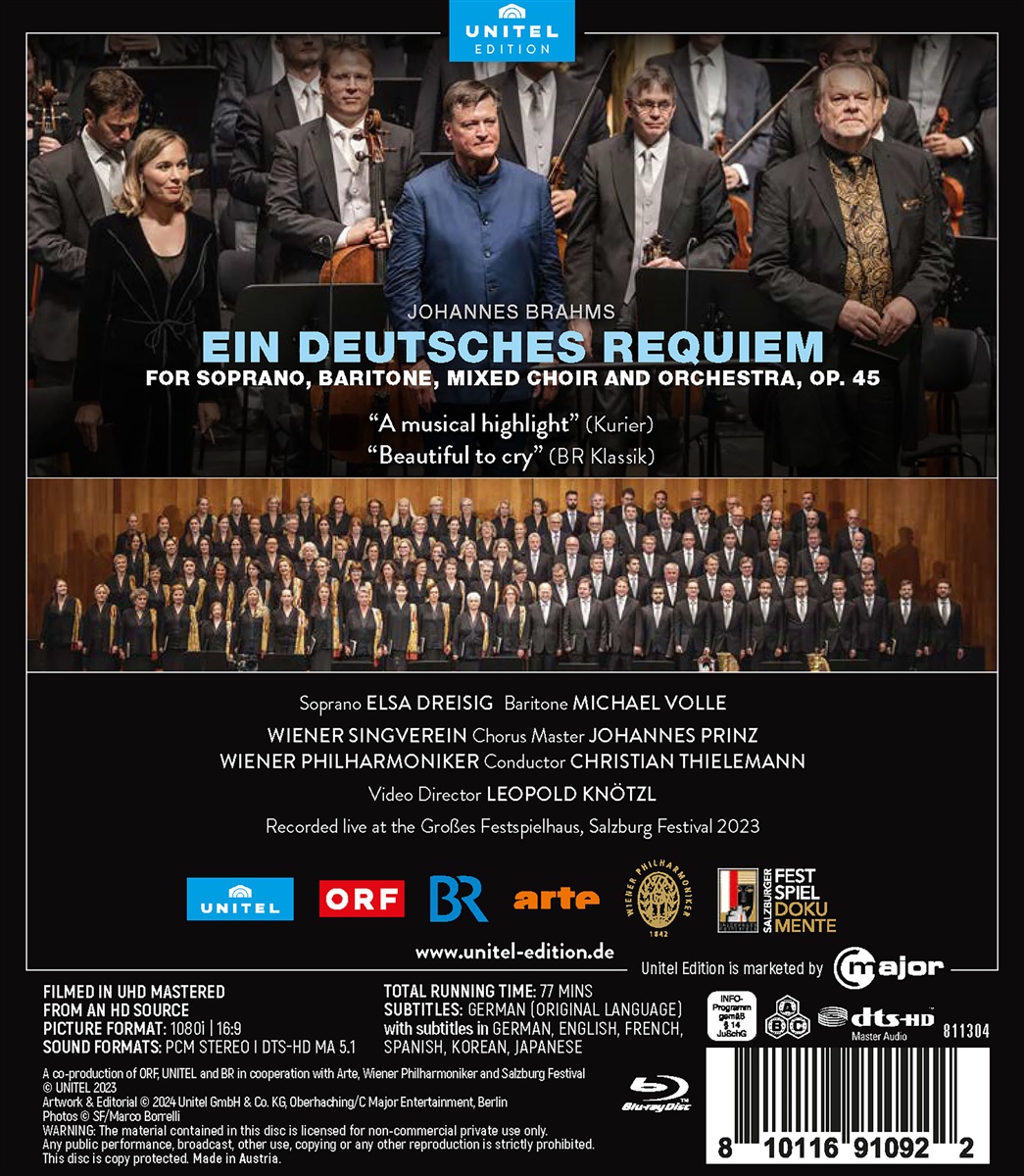 Als Brahms sein „Ein deutsches Requiem“ komponierte, dachte er weniger an das Seelenheil der Verstorbenen, als an die Hinterbliebenen: Mit seiner Musik wollte er Trost spenden. Folgerichtig entschied er sich gegen den üblichen, abstrakten lateinischen Text und wählte stattdessen deutsche Texte aus der Lutherbibel aus. In dieser Aufführung aus dem großen Festspielhaus in Salzburg vom August 2023 beschwören Christian Thielemann, die Wiener Philharmoniker, der Wiener Singverein und zwei brillante Solisten – die Sopranistin Elsa Dreisig und der Bariton Michael Volle – genau diese zutiefst menschliche Regung des Trostes herauf. Thielemanns Dirigat wurde für ihr ‚harmonisches Gleichgewicht zwischen Intimität und archaischen Momenten‘ von der Presse begeistert aufgenommen.