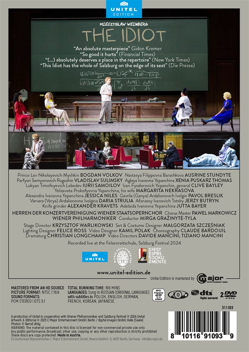 Weinbergs letzte Oper nach Dostojewskis Roman verdichtet die Handlung, ohne ihre psychologische Tiefe zu verlieren. Der geisteskranke, aber an das Gute glaubende Fürst Myschkin begegnet im Zug dem Kaufmann Rogoschin, was eine Geschichte von Abhängigkeit, Wahnsinn und Mord auslöst. Die im letzten Jahrzehnt wiederentdeckte Oper zeigt den Komponisten Weinberg als Schostakowitsch ebenbürtig. Der Idiot, 1986-1989 komponiert, 2024 in Salzburg inszeniert, in der Regie von Krzysztof Warlikowski und unter der Leitung von Mirga Gražinytė-Tyla, bringt die Welt der Literatur auf die Opernbühne. Die hervorragende Besetzung der Sängerinnen und Sänger trug dazu bei, dass die Produktion ein großer Erfolg wurde. Bogdan Volkov „berührt als ausdrucksstarker lyrischer Tenor innig im Piano und bleibt dennoch allen orchestralen Stürmen gewachsen“ (BR Klassik).